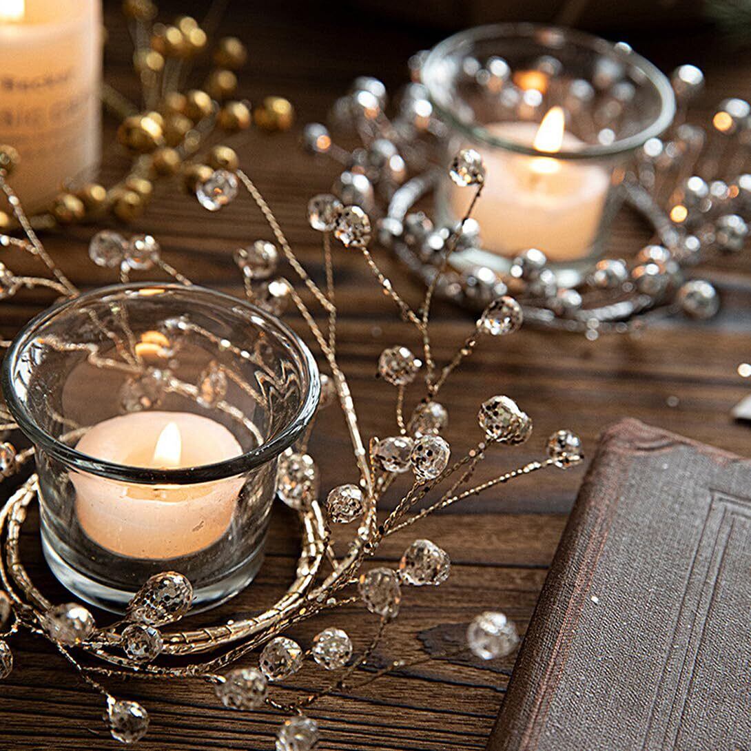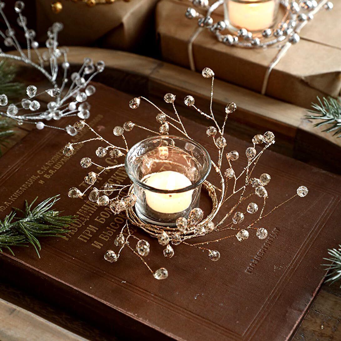 特徴:この金色のキャンドルホルダーは、針金でアクリルビーズを連結し、不規則に輪を作っているので、華やかでいつでも使えます。
