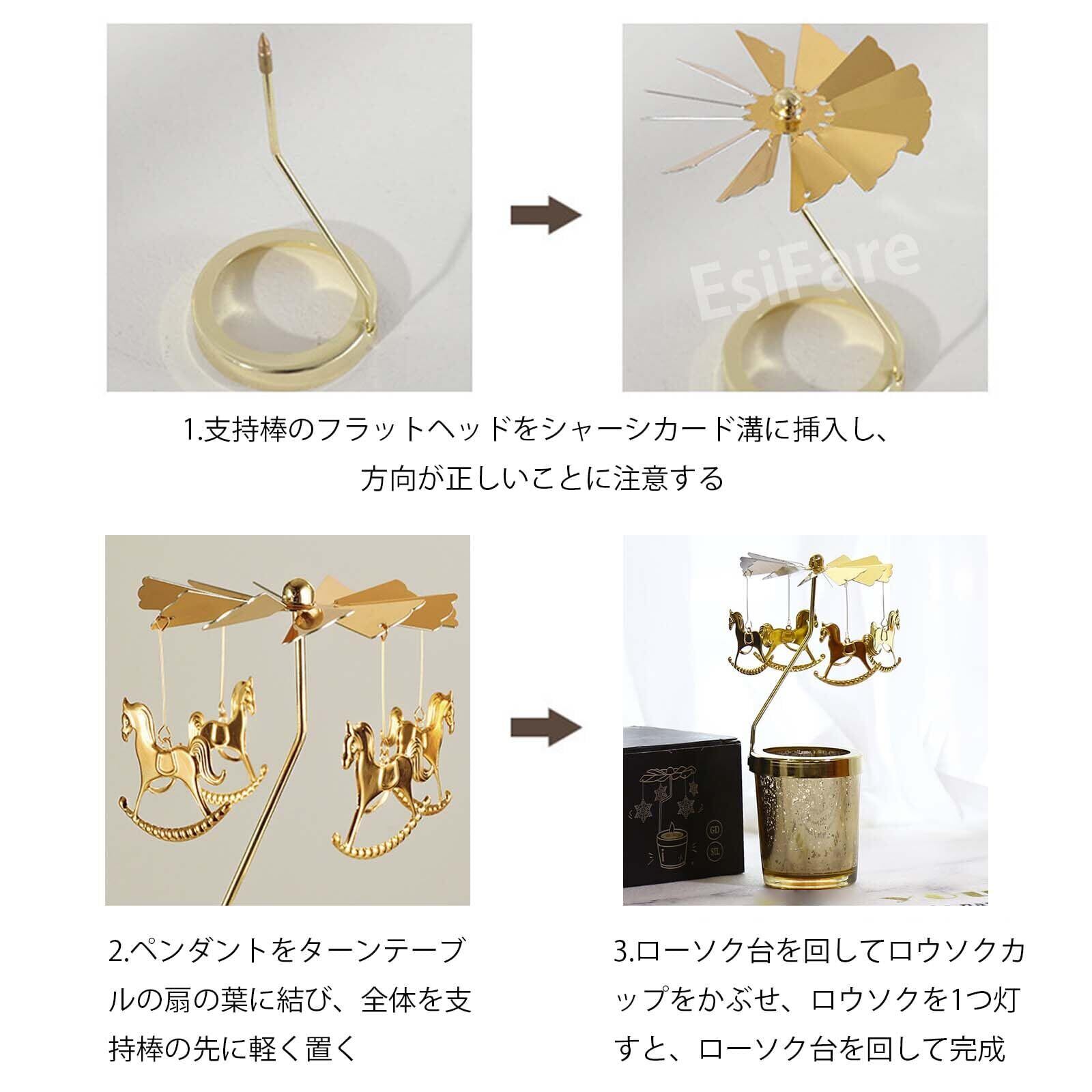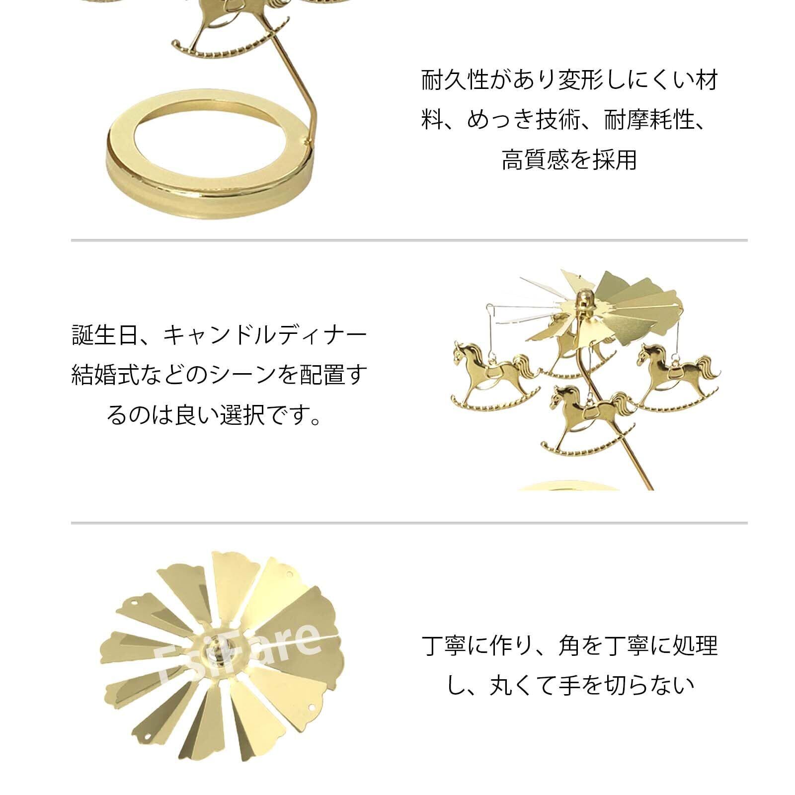 【注意事項】このロータリーキャンドルホルダーの回転速度は季節や気温の変化により変化します。初めてキャンドルに点火するときは、キャンドルが均一に燃焼し、熱風が上昇してファンブレードが安定して回転するまで待ってください。 場所やスペースにも依存します。たとえば、エアコンの効いた部屋で使用すると、温度差の影響で明らかにキャンドルの回転が遅くなり、サポートロッドの位置を適切に移動できます。キャンドルが燃焼すると、その熱でファンの羽根が回転しますので、使用中は回転する付属品に手を触れないでください。ご使用の際は触れないようにし、火傷に注意してください。