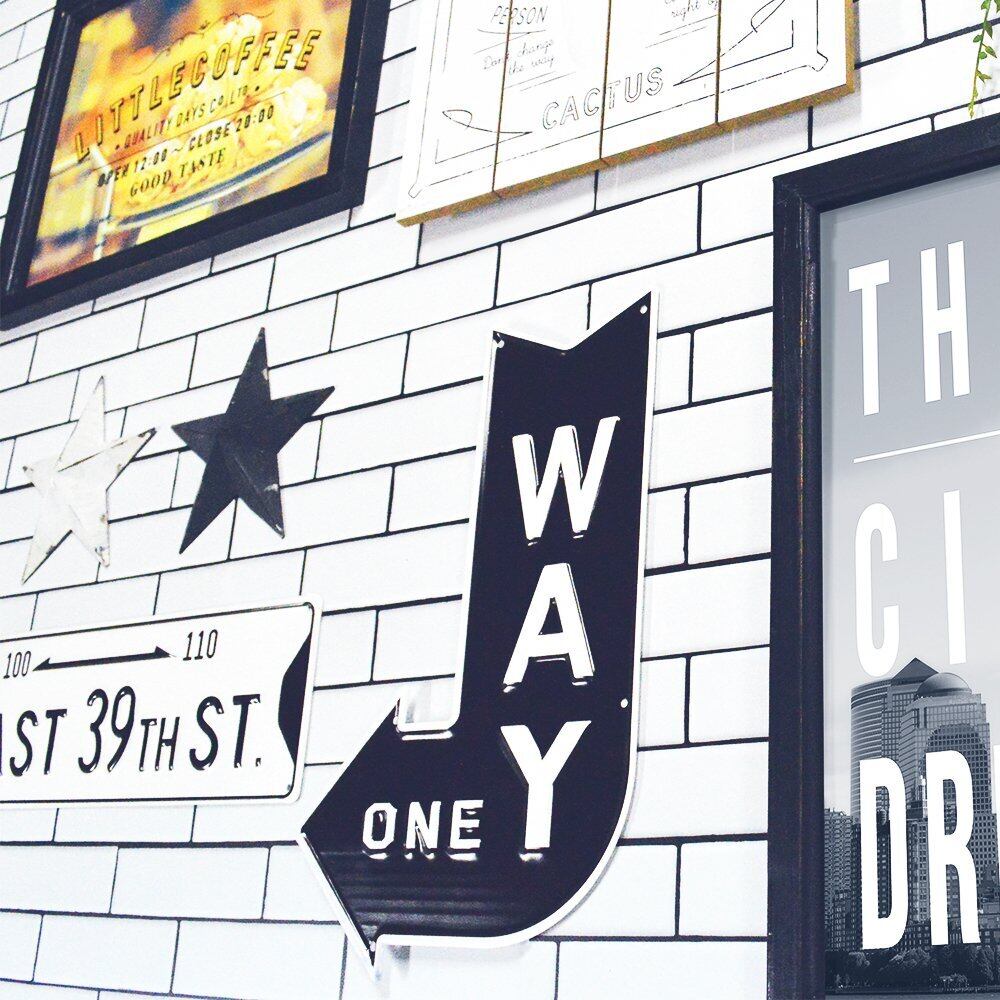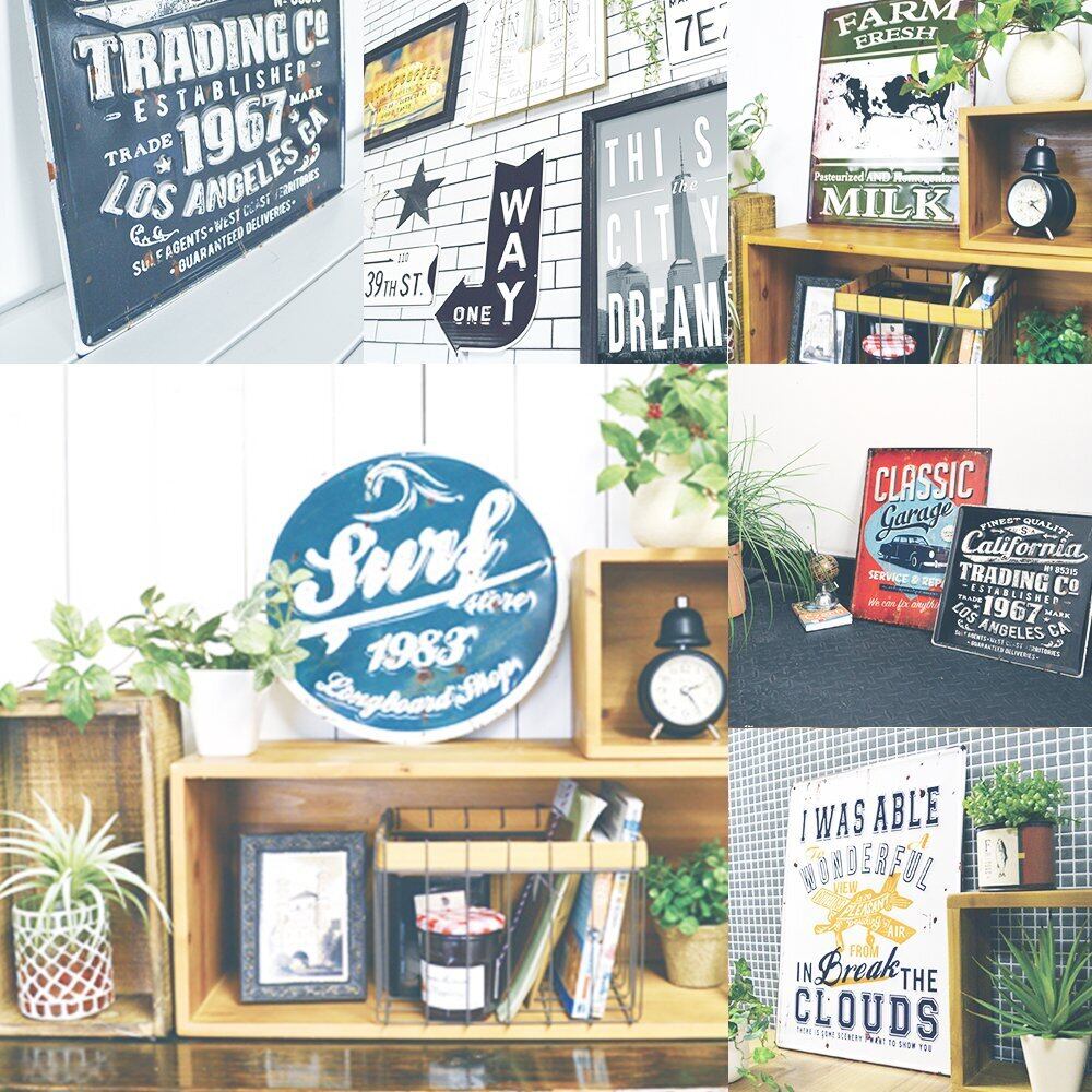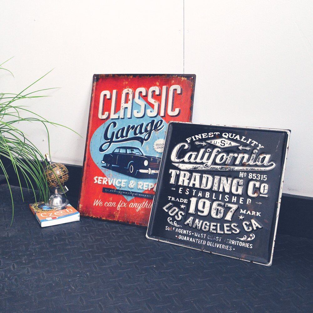 古い時代のショップやガレージのサインをモチーフに作られたブリキ看板