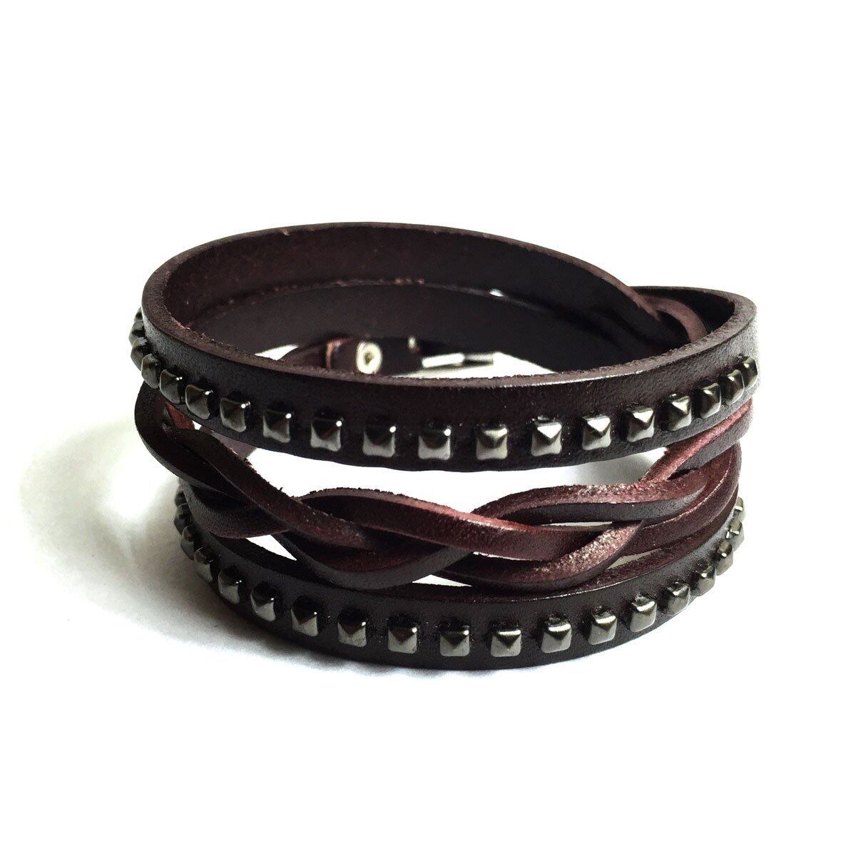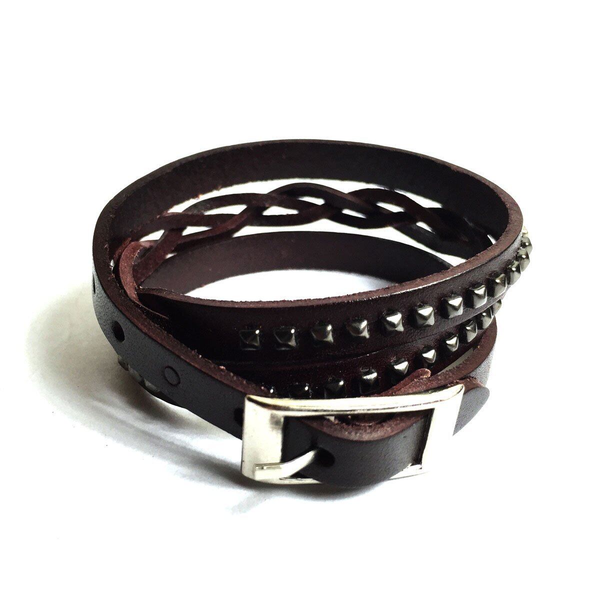人気のスタイル三つ編み&スタッズレザーブレスレット シンプルに際立つ存在感。深みのある、渋い色の本革レザーブレスレット。 自分だけの巻き方で色んなアレンジを楽しめるので、ファッションをより楽しくさせてくれるアイテム。 [サイズ]縦:61cm、横:0.7cm、厚さ:0.3sm、腕周り:17cm~19cm(5段階調節可能)。[重量]15g。[素材]本革。