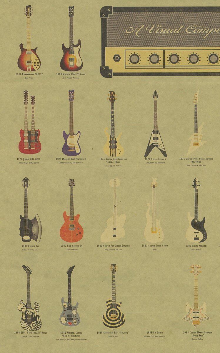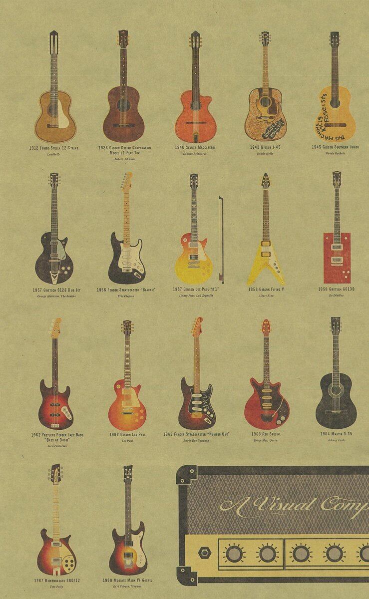 世界中の有名なギターを集めたポスターです(B3サイズ)。おしゃれなデザインはインテリアに最適!フレームは付属しません