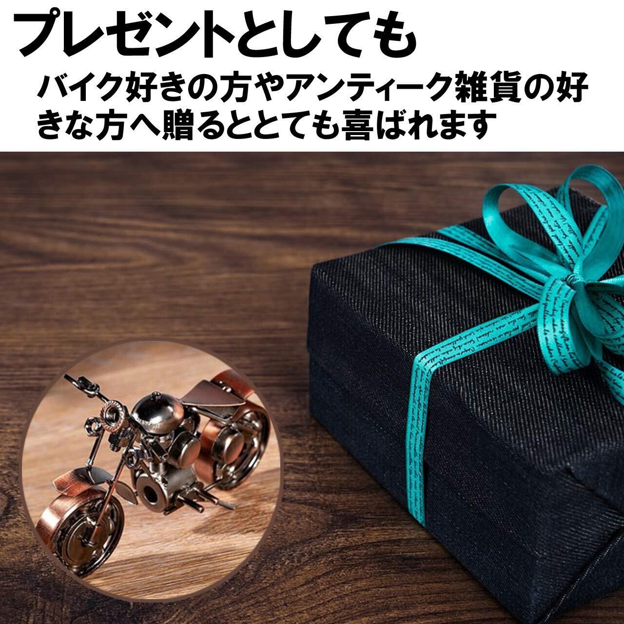 このバイクのオブジェはアンティーク調の風合いがとても目を引きます。手のひらサイズの中に一台のバイクが精巧に作られています。何もなかった空間にそっと置くだけでワンランク上のインテリアを楽しむことができます。