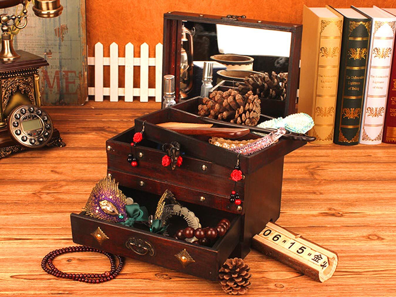 Anberotta コスメ メイクボックス ジュエリーボックス 小物入れ 化粧品 ミラー 鏡付き 木製 アンティーク調 ケース 宝石箱 収納箱 アクセサリー ビンテージ AT28 (Aタイプ)