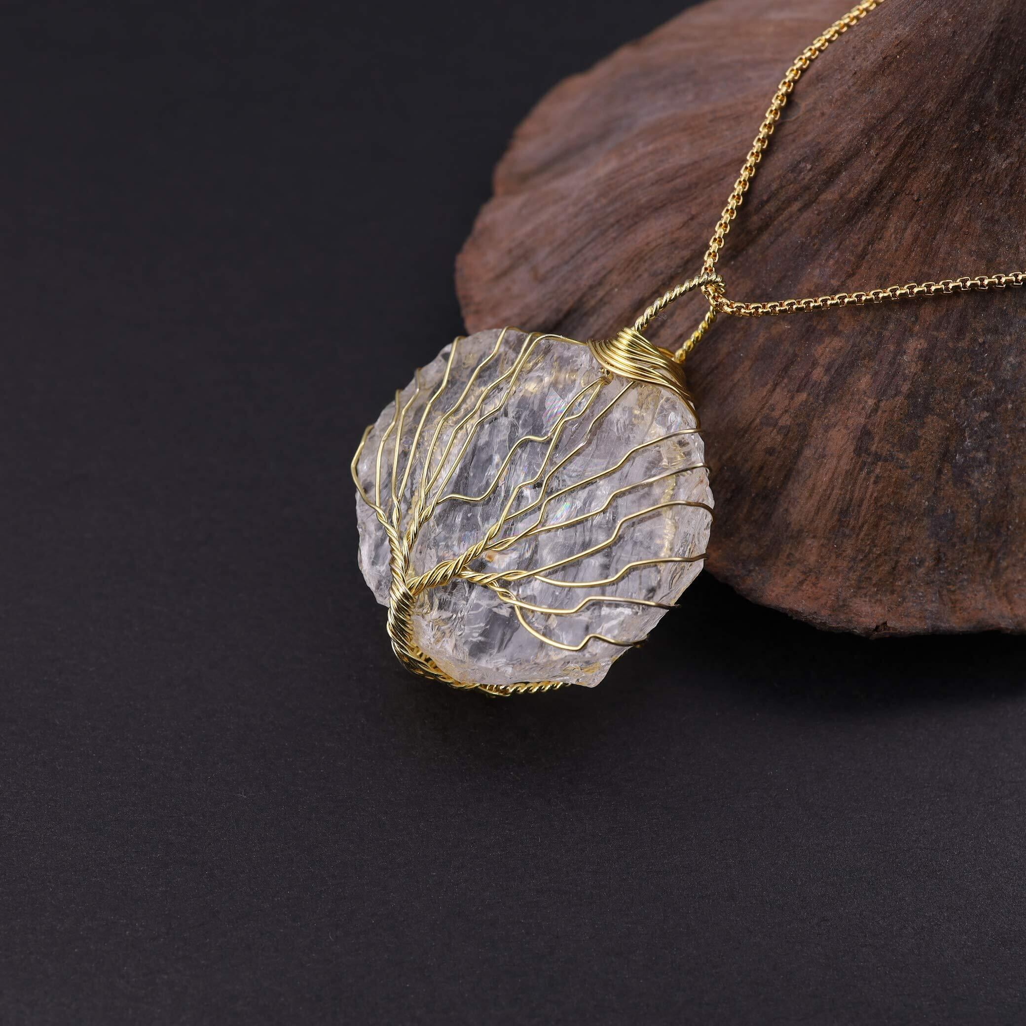 水晶の生命の木ネックレスは、透明な水晶と生命の木のモチーフが融合し、成長や調和を象徴します。シンプルで清らかな輝きが胸元を美しく引き立て、日常に自然のエネルギーを感じられるアイテムです