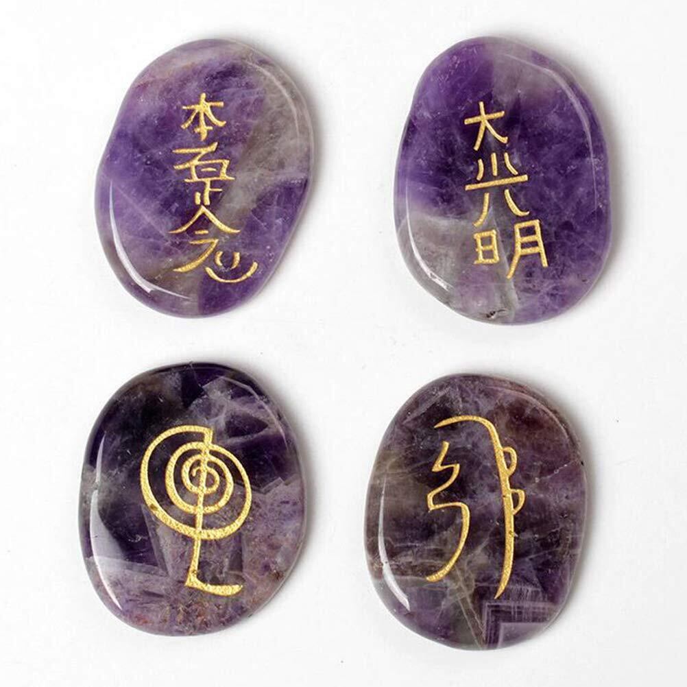 (イスイ)YISHUI 4個 犬歯 アメジスト 刻印された チャクラストーン シンボル セット レイキ ヒーリング クリスタル置物 誕生日 プレゼント W3474
