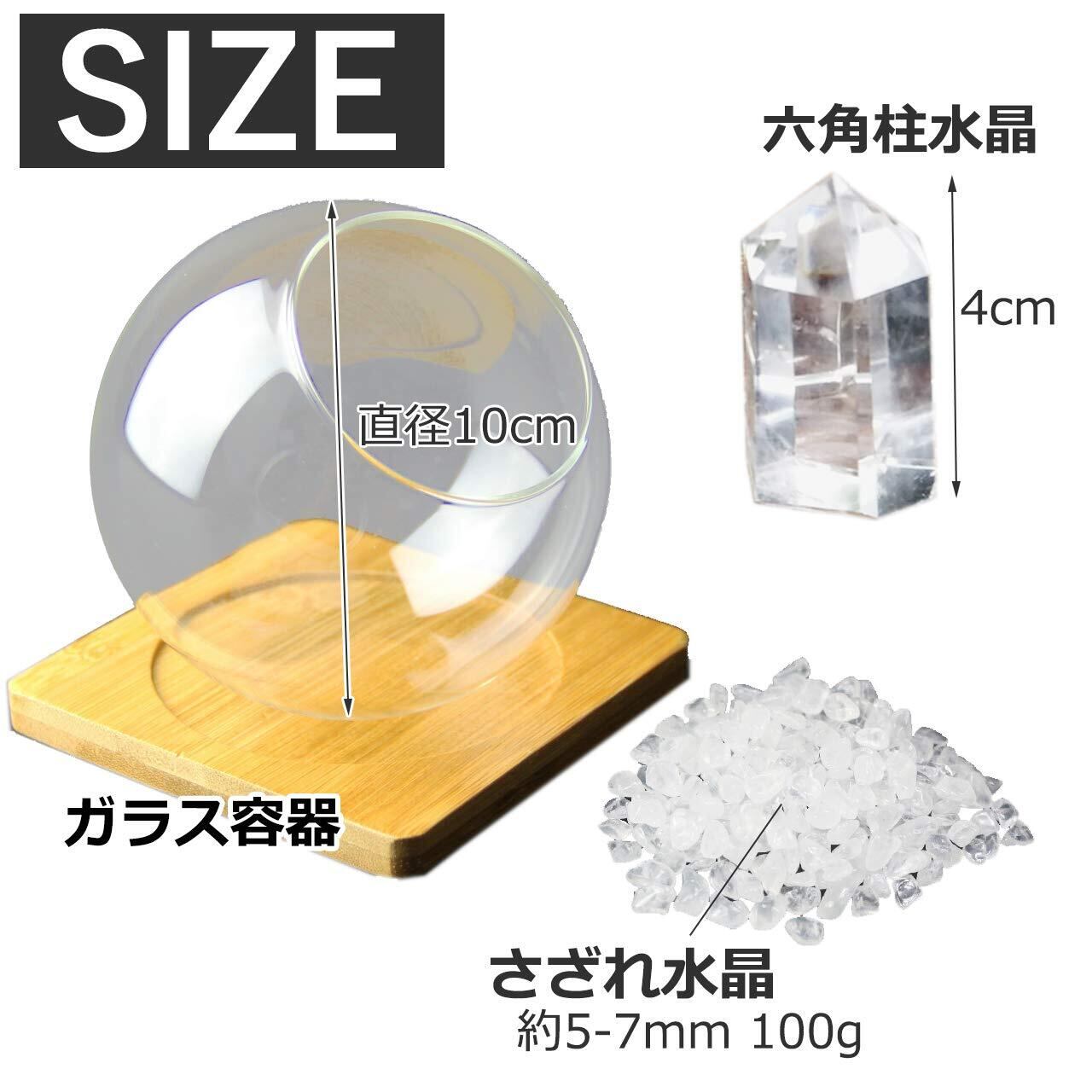水晶のパワーを身近に感じられるセット:高い自浄能力があると言われ、古くから風水などに取り入れられてきた水晶。パワーストーンの中でももっとも人気の高い水晶六角柱、水晶さざれ、水晶を収める球体のガラス容器をセットにしました。ガラス容器には木製の台も付属し、安定した設置が可能です。