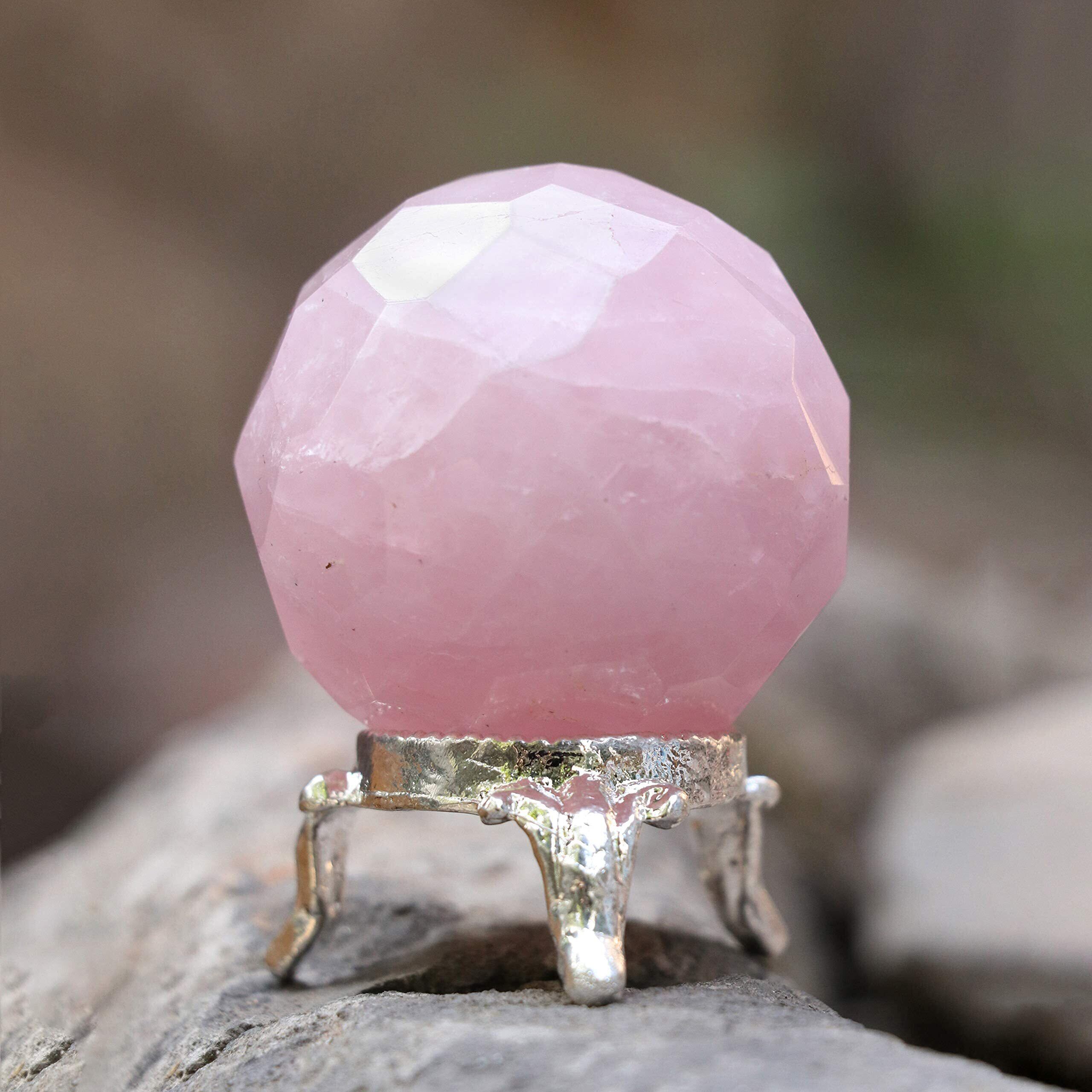 Croconローズクォーツダイヤモンドカットクリスタルボールメタルスタンド付き|ジェムストーンボールヒーリングスフィア彫刻フィギュア| 風水占いの家の装飾のための|水晶球| サイズ:40-50mm