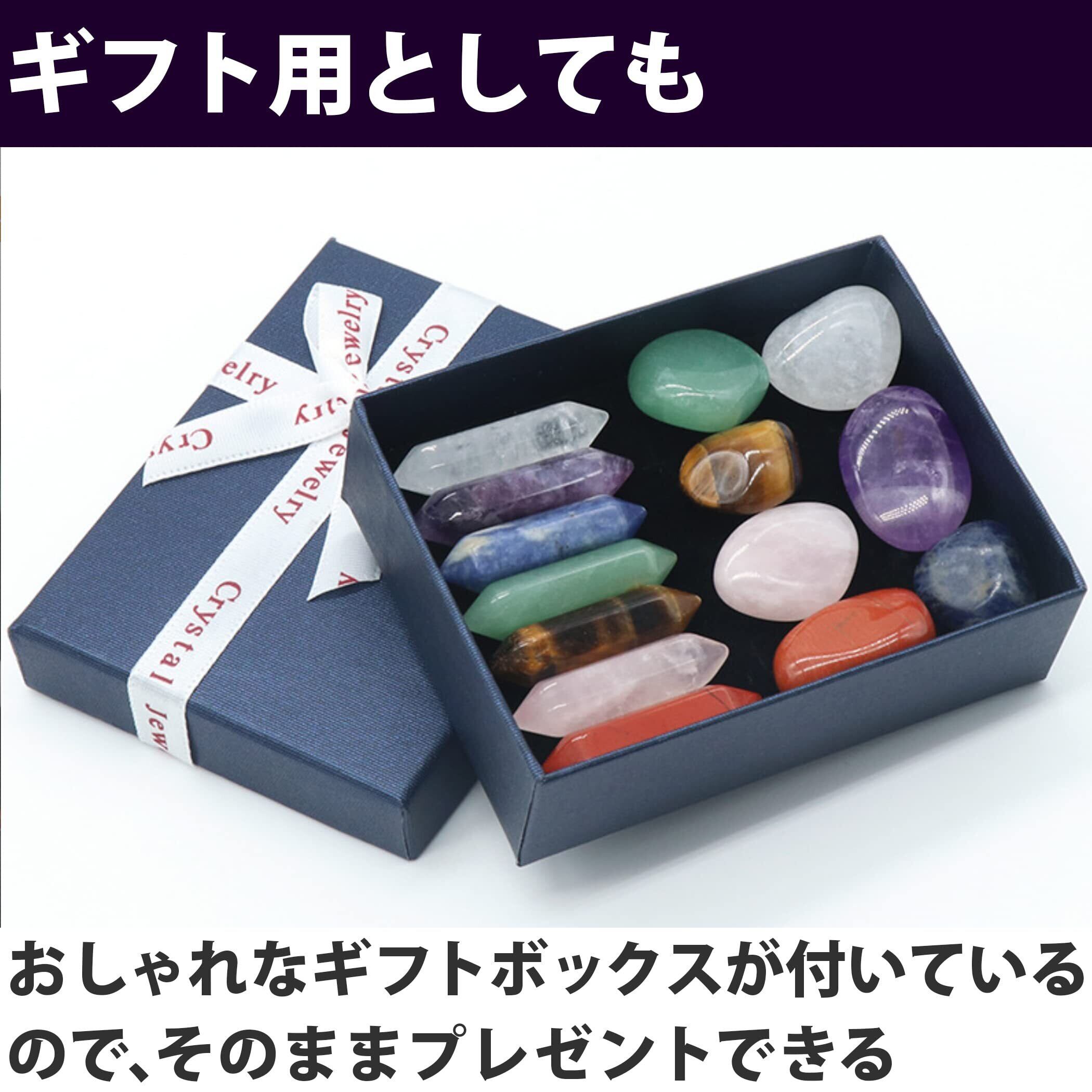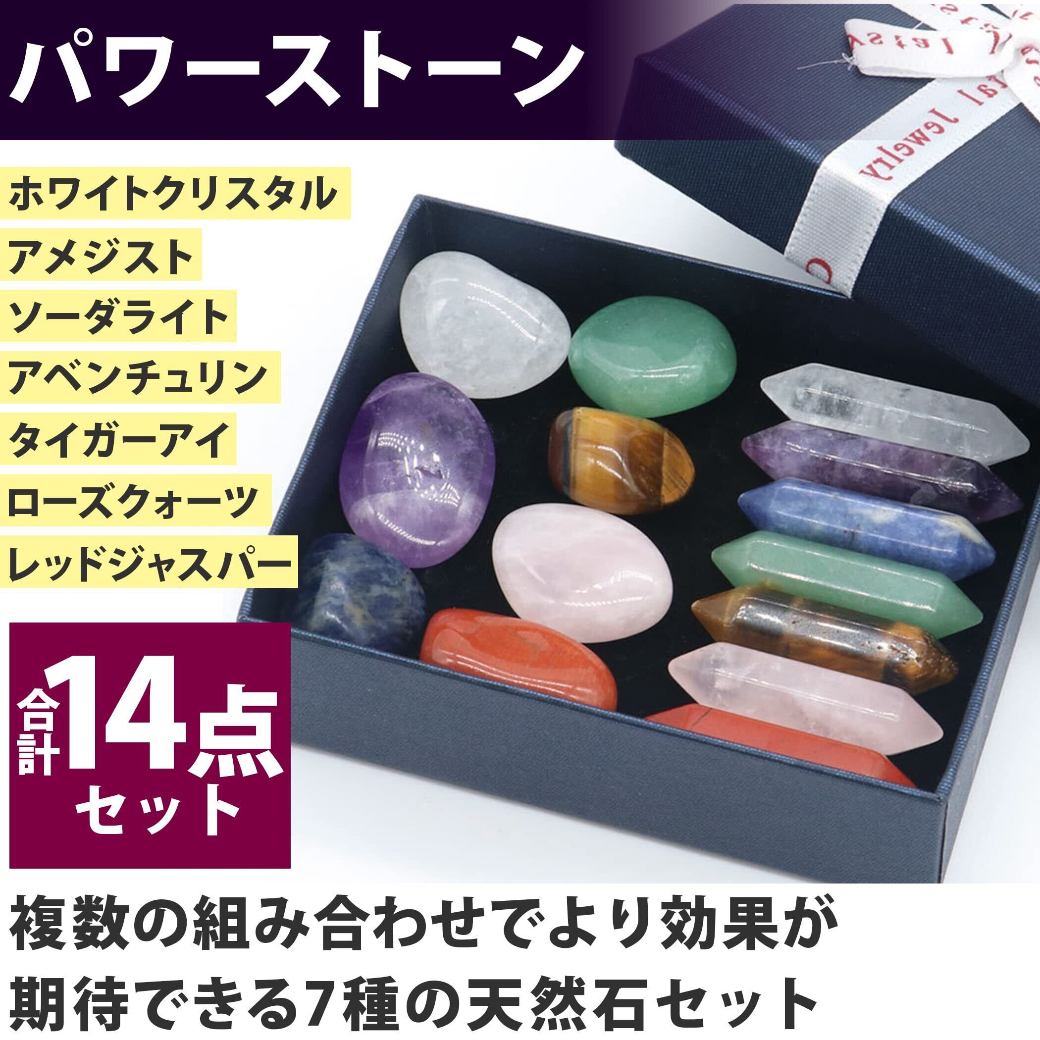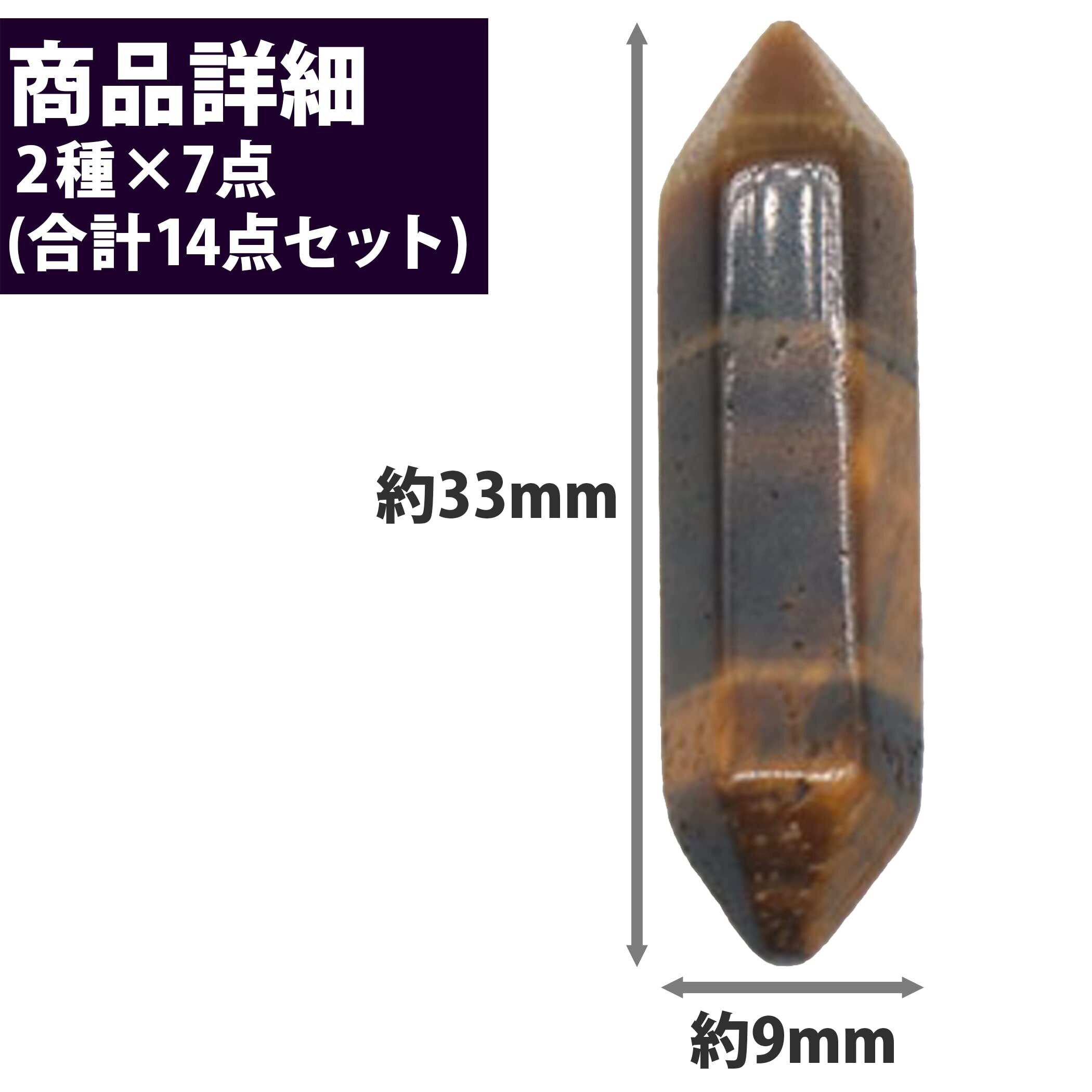 セット内容:ストーンタイプの天然石×7種、六角柱タイプの天然石×7種 石の種類:ホワイトクリスタル、アメジスト、ソーダライト、アベンチュリン、タイガーアイ、ローズクォーツ、レッドジャスパー 六角柱タイプのサイズ:約33×9mm ※モニターの環境等により、色の見え方に若干差が生じる場合がございます。