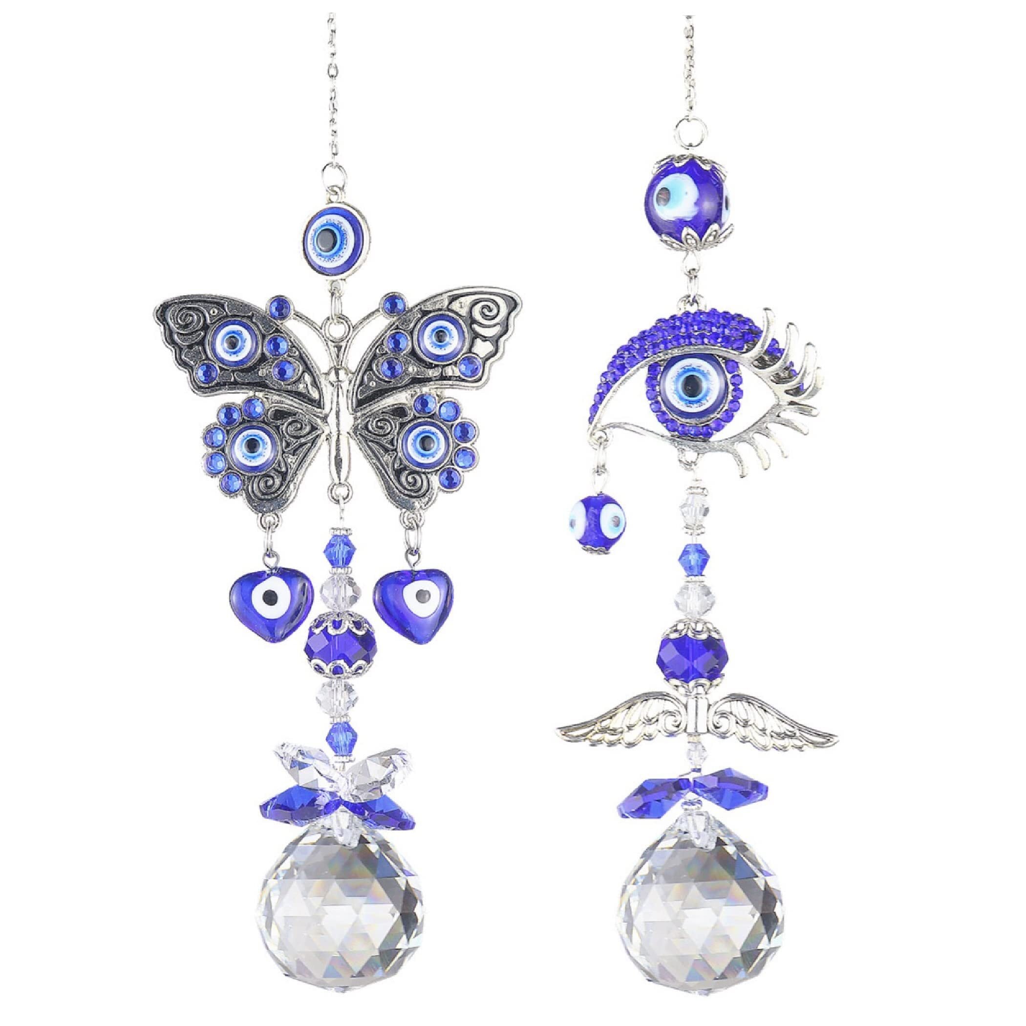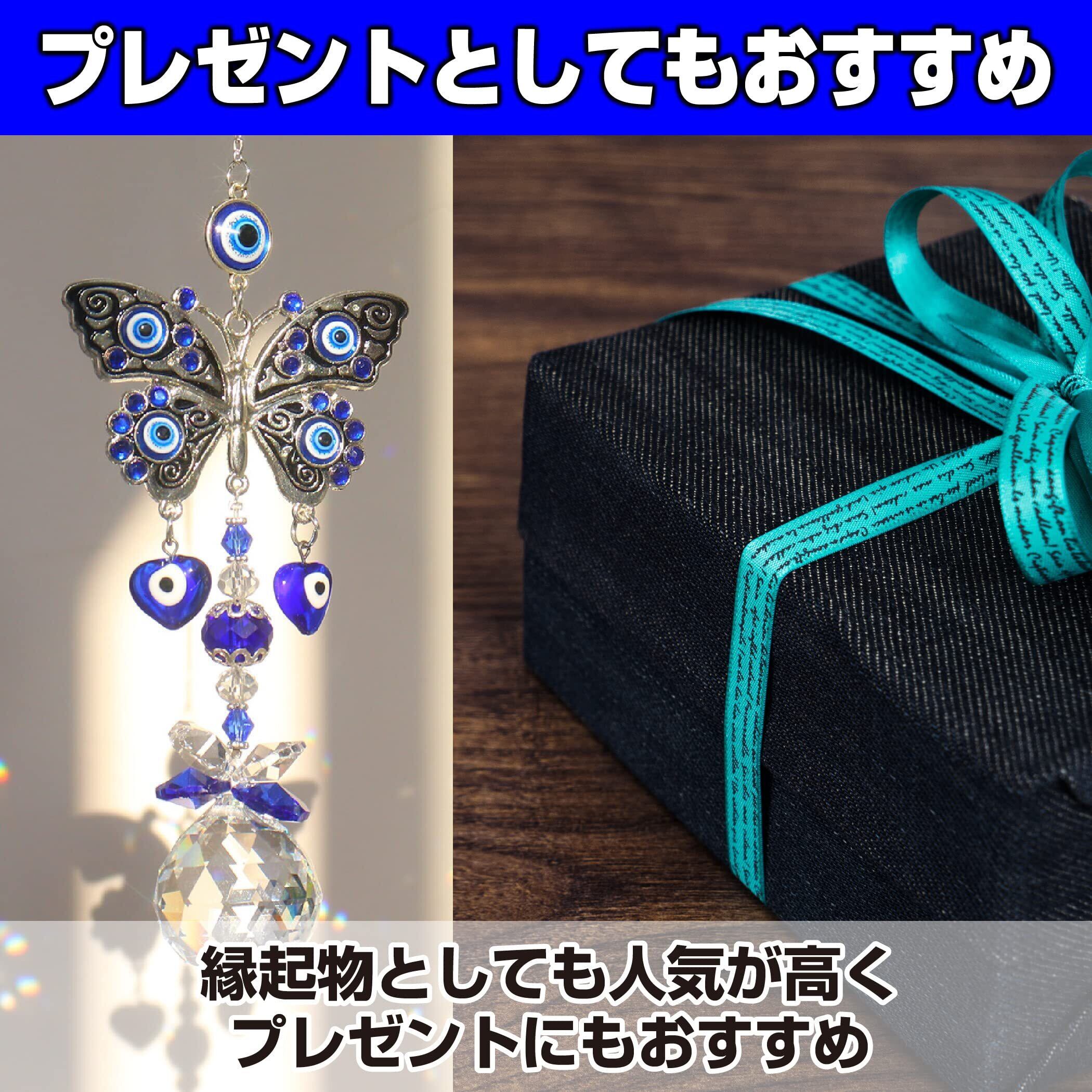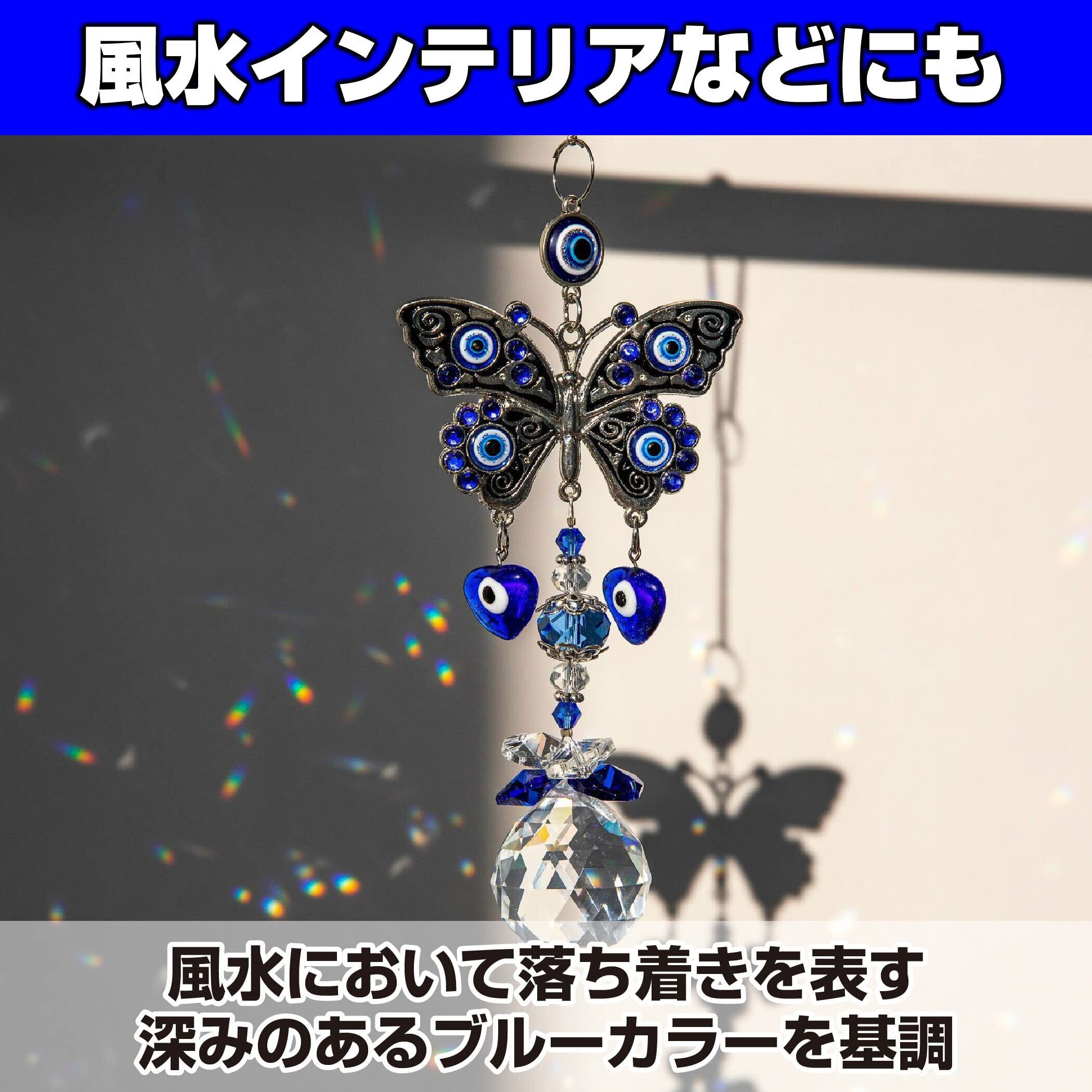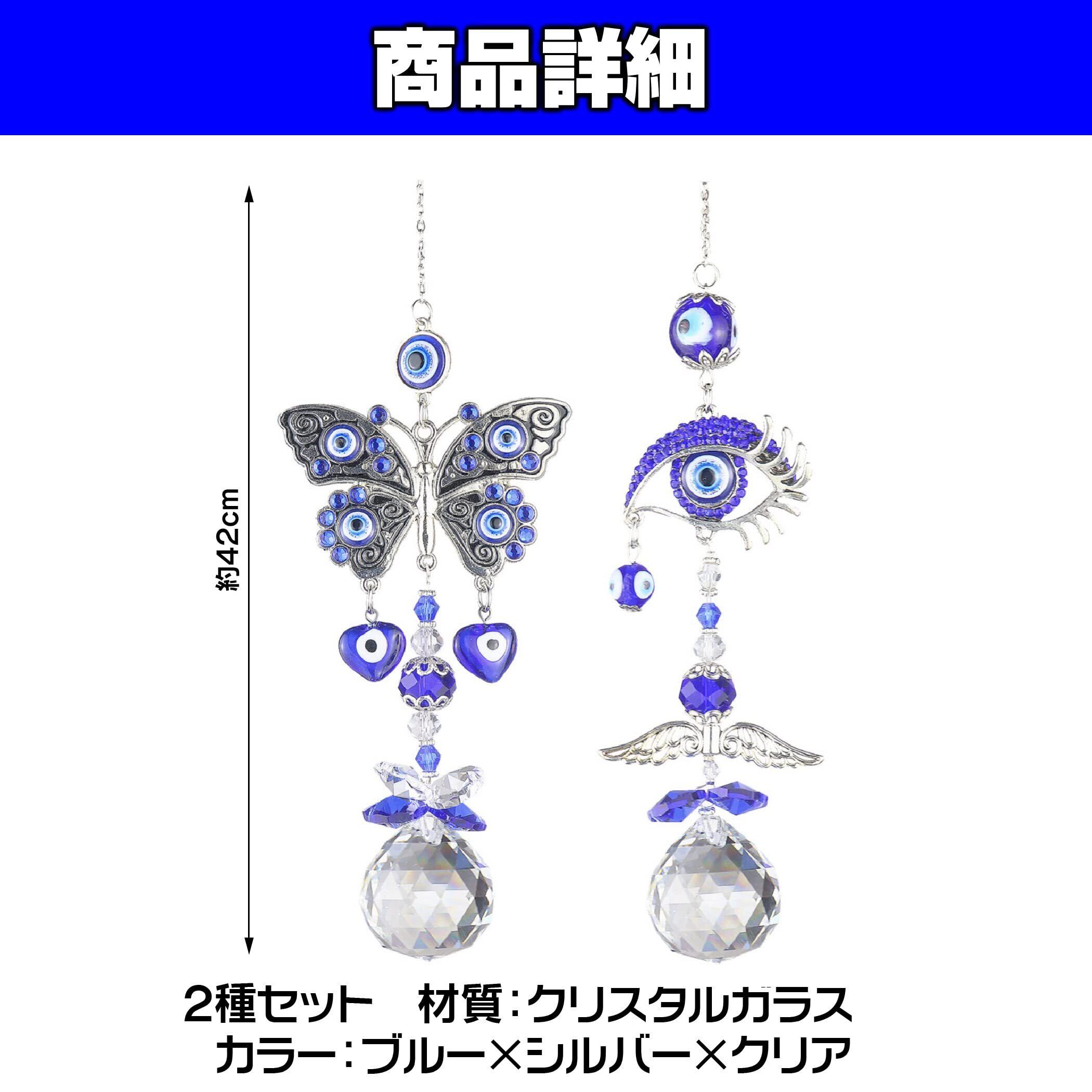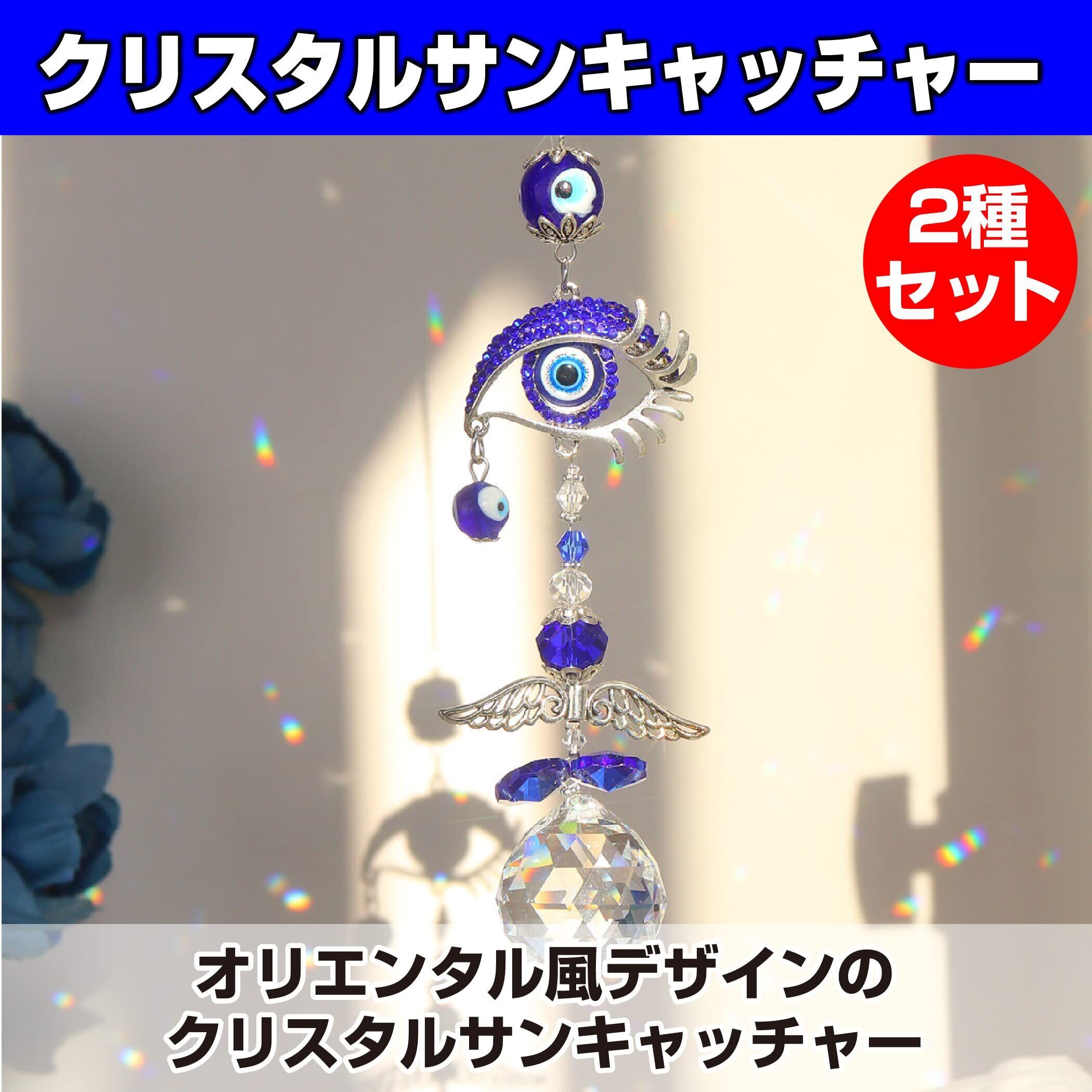 オリエンタル風のサンキャッチャー:お守りや魔除けの品としてインテリアに取り入れる方も多い、オリエンタル風デザインのクリスタルサンキャッチャーです。大きな目をモチーフにしたデザインと蝶をモチーフにしたデザインの2種類のサンキャッチャーが揃ったセット品ですので、玄関や窓辺など、複数箇所に飾ったりすることもできます。