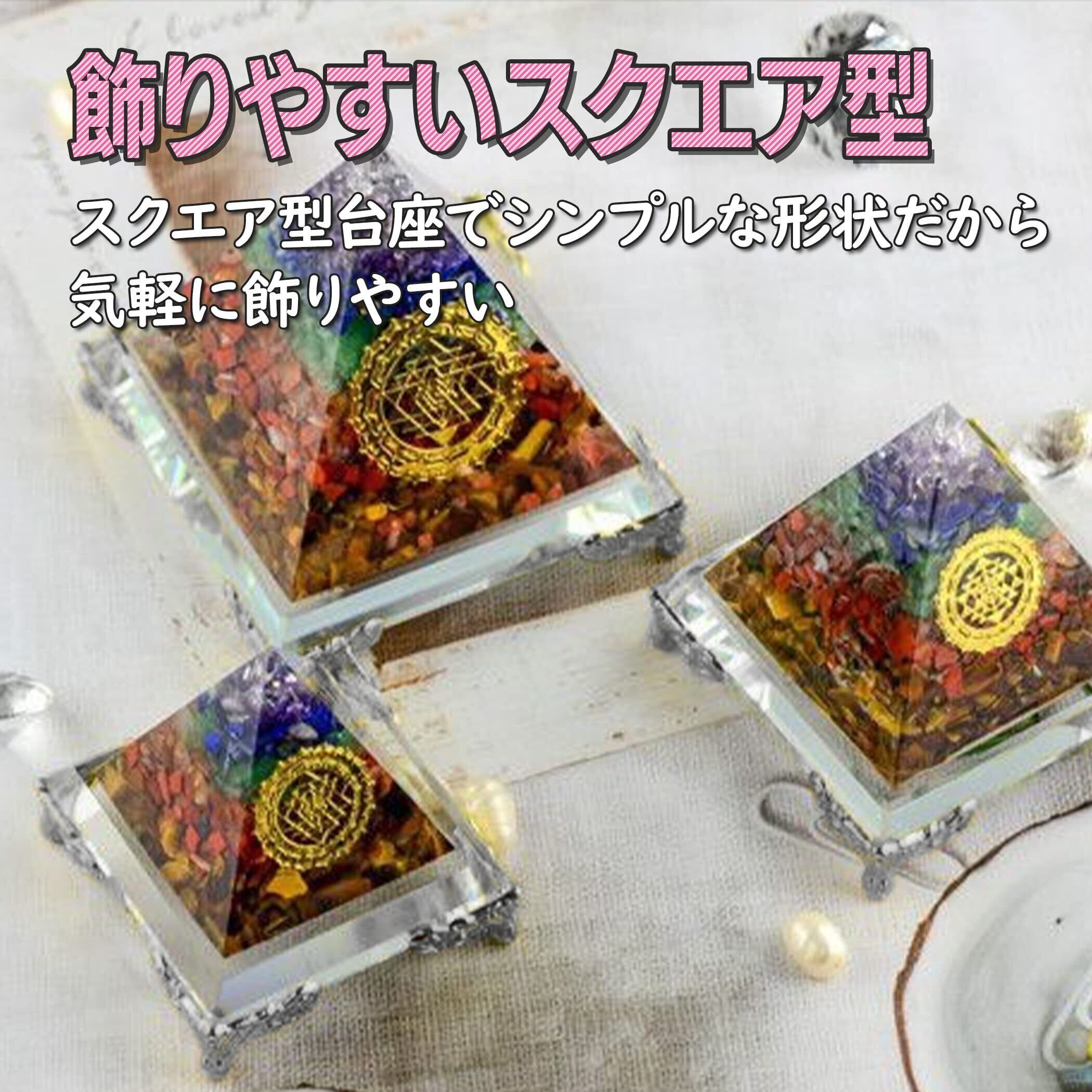 飾りやすいスクエア型:正方形のスクエア型台座でシンプルな形状ですので、気軽に飾りやすいです。サイズが約70×70mmのピラミッド型オルゴナイトに適応しています。