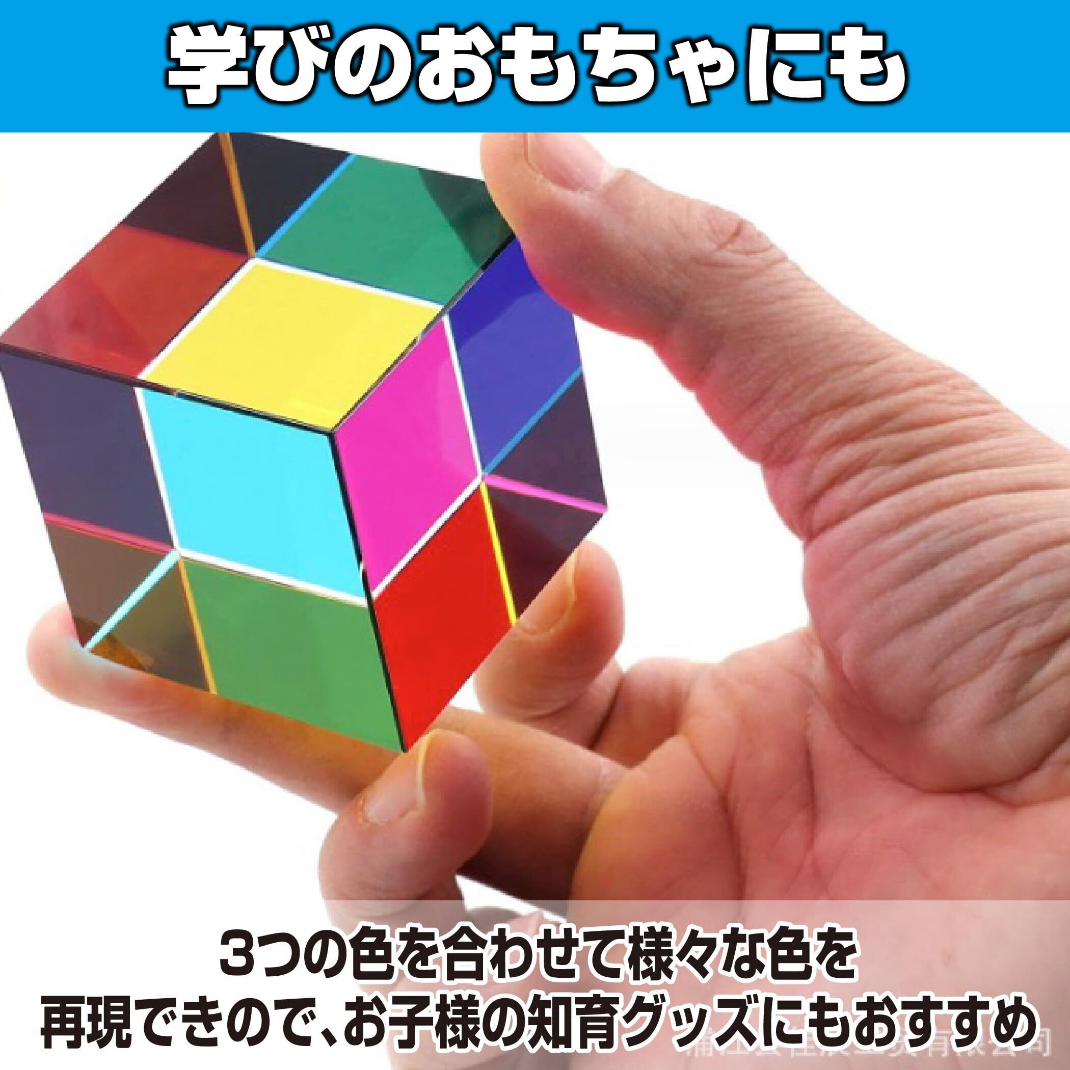 マゼンダ、シアン、イエローの3原色から成るプリズムキューブ:マゼンダ、シアン、イエローの3色を表面にプリントした透明なキューブです。このプリズムキューブを光にかざして覗いてみれば、組み合わせによる様々な色の変化をお楽しみいただけます。