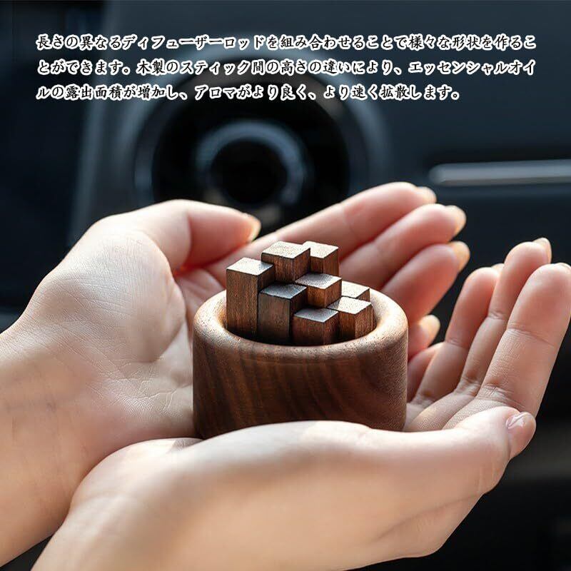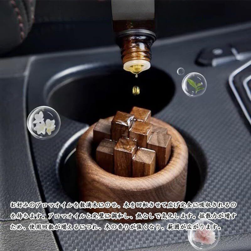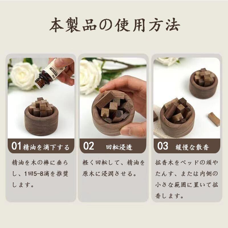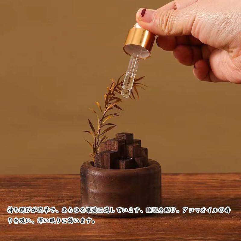 【使いやすさ】お好みのアロマオイルを数滴木にのせ、木を回転させて広げ完全に吸収されるのを待ちます。アロマオイルと完璧に調和し、熱なしで気化します。拡散力が増すため、使用回数が増えるにつれ、木の香りが強くなり、範囲が広がります。