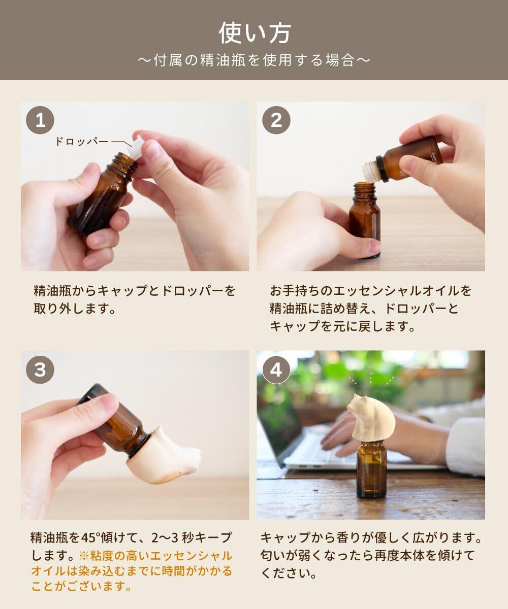 『ご注意』※エッセンシャルオイルは付属しておりません。別途お買い求めください。※お手持ちの精油瓶を装着させる場合、精油瓶の種類によっては装着できないものもございます。※キャップは一点ずつ手作業で制作しているため、色・形・大きさには個体差がございます。また天然木のため、木目には個体差があります。予めご了承ください。※本商品は保管用のキャップではありません。