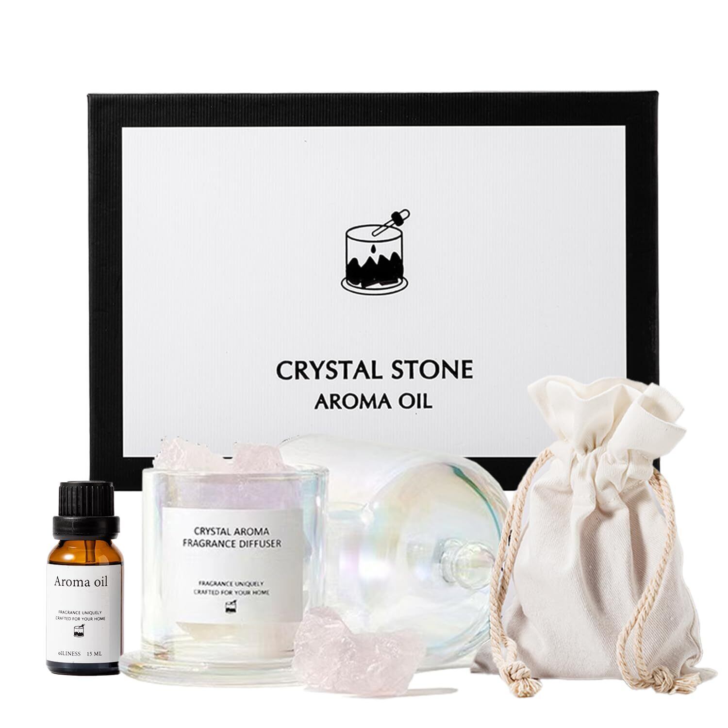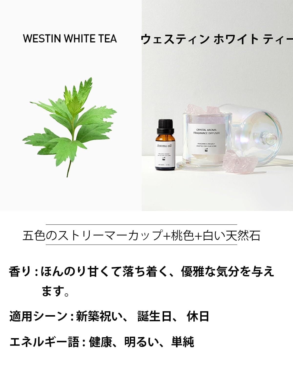 OZYBIR アロマストーンセット 【アロマストーン300g+エッセンシャルオイル15ml+蓋付き半透明ガラス容器+お揃いの巾着袋とギフトボックス】 ストーンディフューザー アロマディフューザー アロマオイル 天然石 パワーストーン クリスタル フレグランスストーン お祝い/バレンタインデー/誕生日/ギフト/プレゼント/贈り物に適用 (ウェスティン ホワイト ティー)