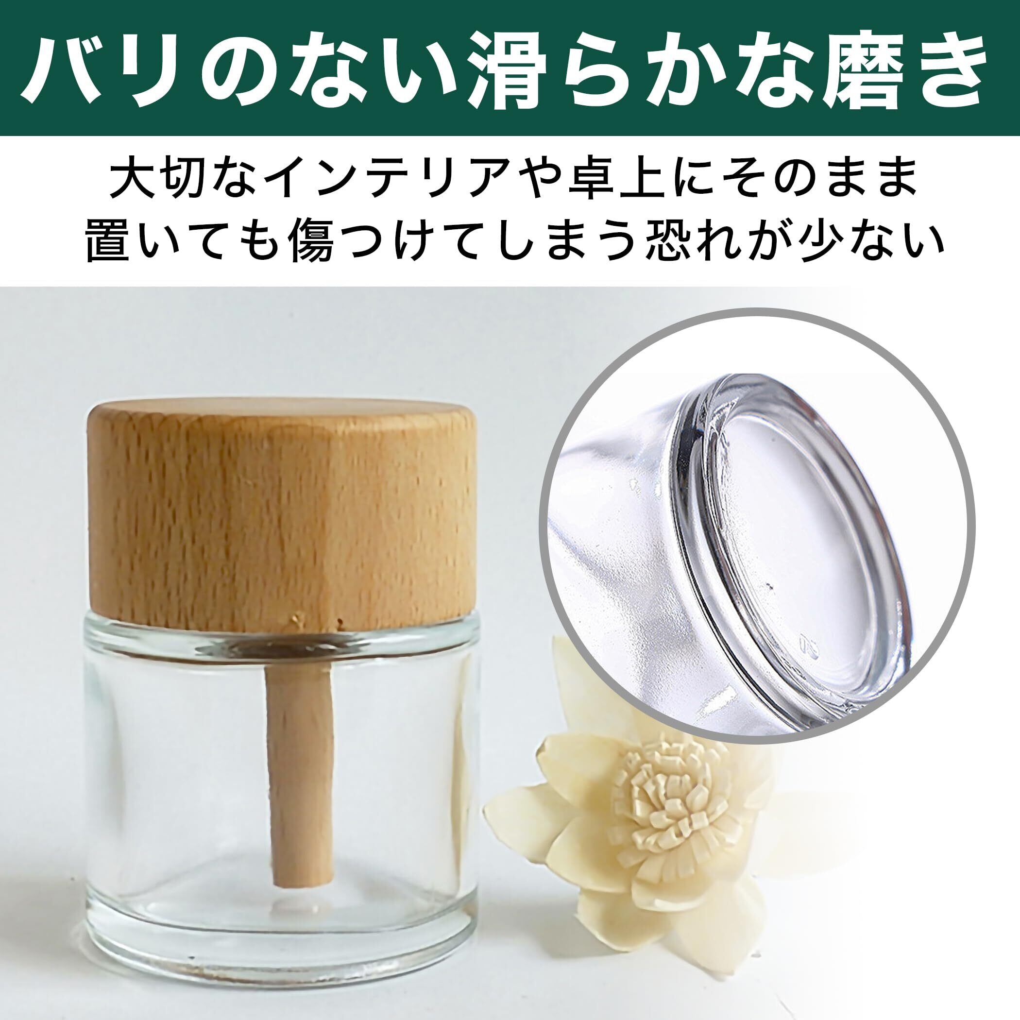 バリのない滑らかな仕上がり:木製のフタ部分もガラスのボトル部分もバリのない滑らかな磨きで触り心地が良い点が特徴です。大切なインテリアや卓上にそのまま置いても傷つけてしまう恐れが少なく、高級感のあるたたずまいのアロマディフューザーです。