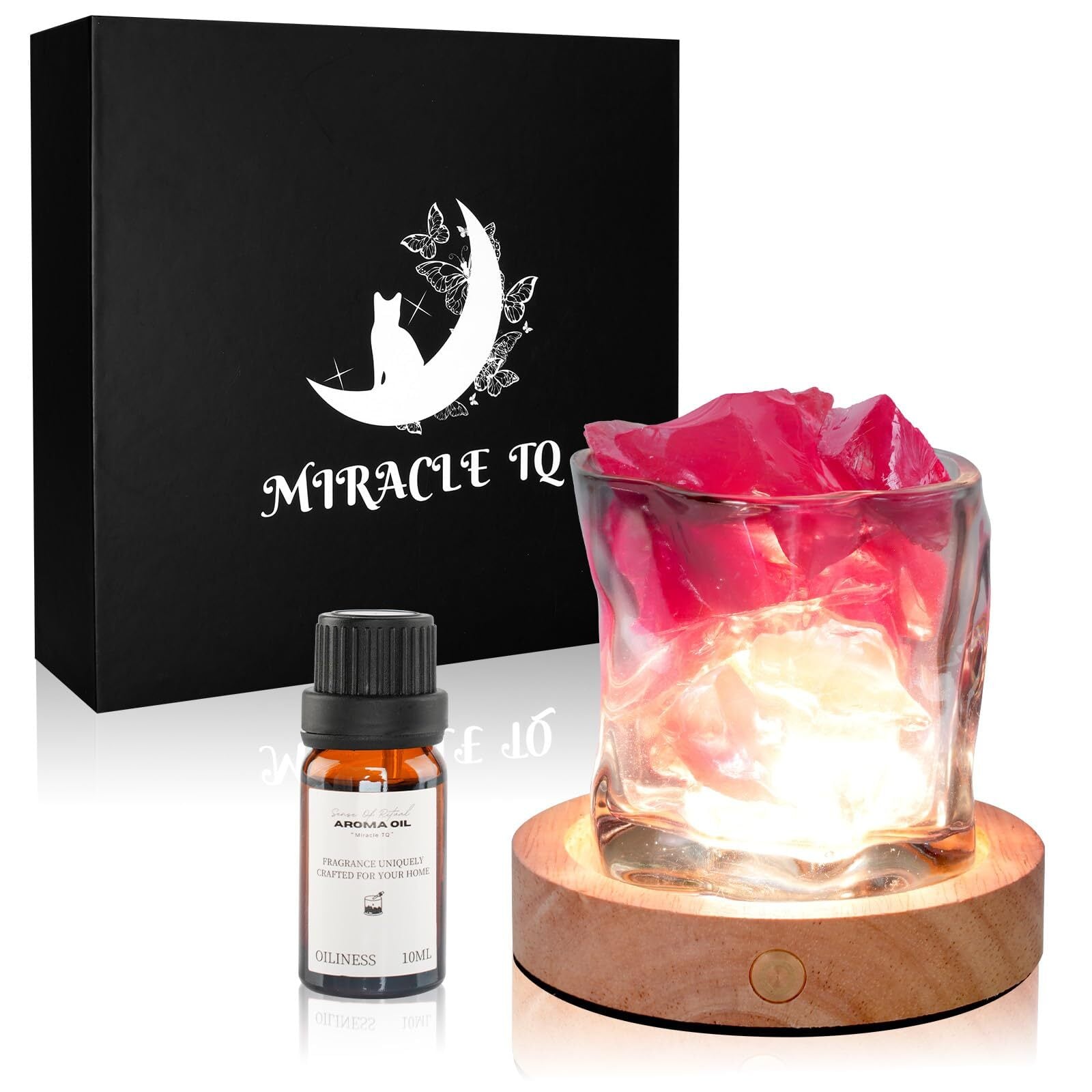 Miracle TQ 充電式ベース取扱説明書セット(エッセンシャルオイル10ml+エナジーストーン330g+スモーキーグレイツイストカップガラスボトル+充電式3色ライト付きLEDベース+取扱説明書)(火を使わないエッセンシャルオイル、ナチュラルディフューザー、クリスタル、空気清浄装飾品、充電式LEDベースが含まれています。) (紅水晶 & 巡り合ラ)