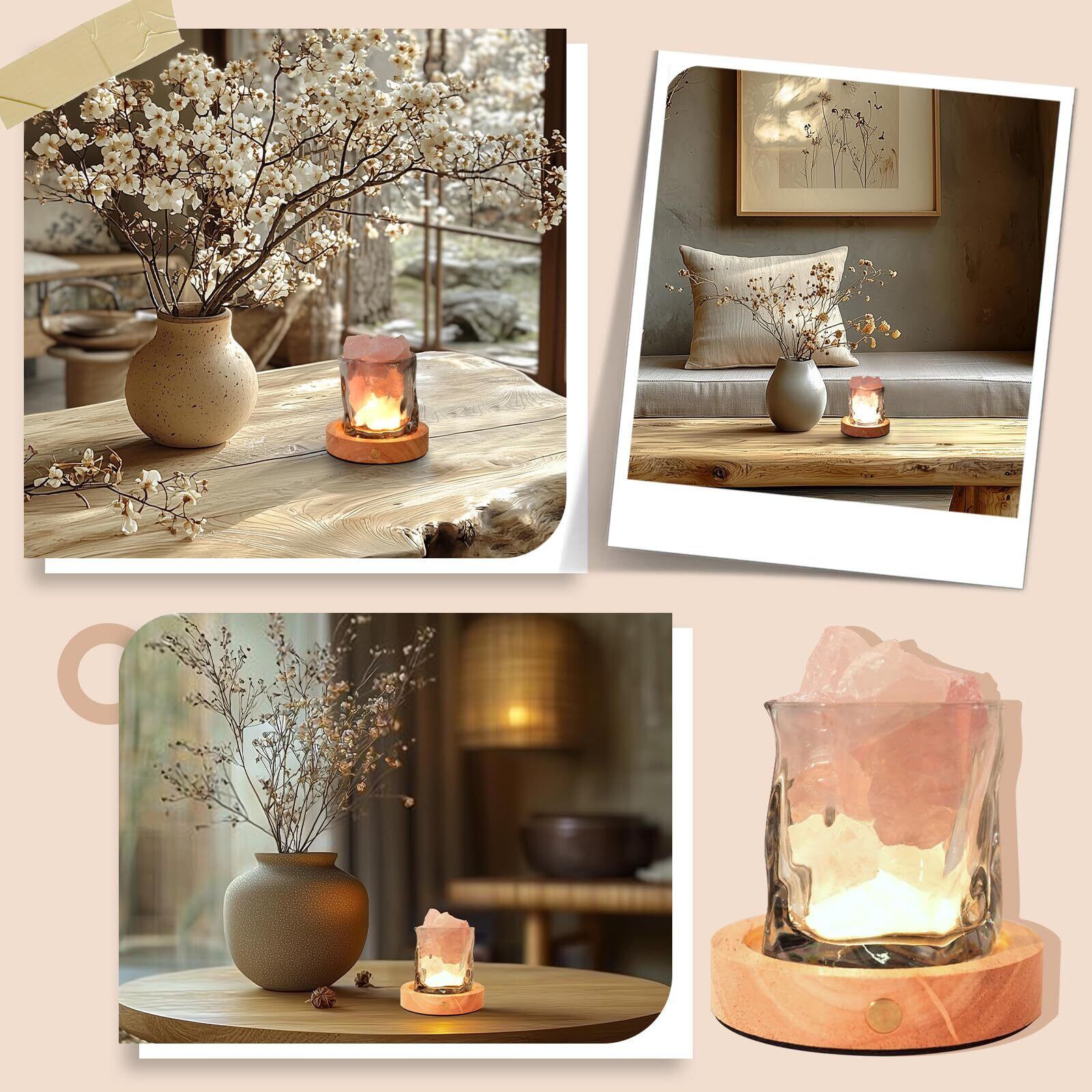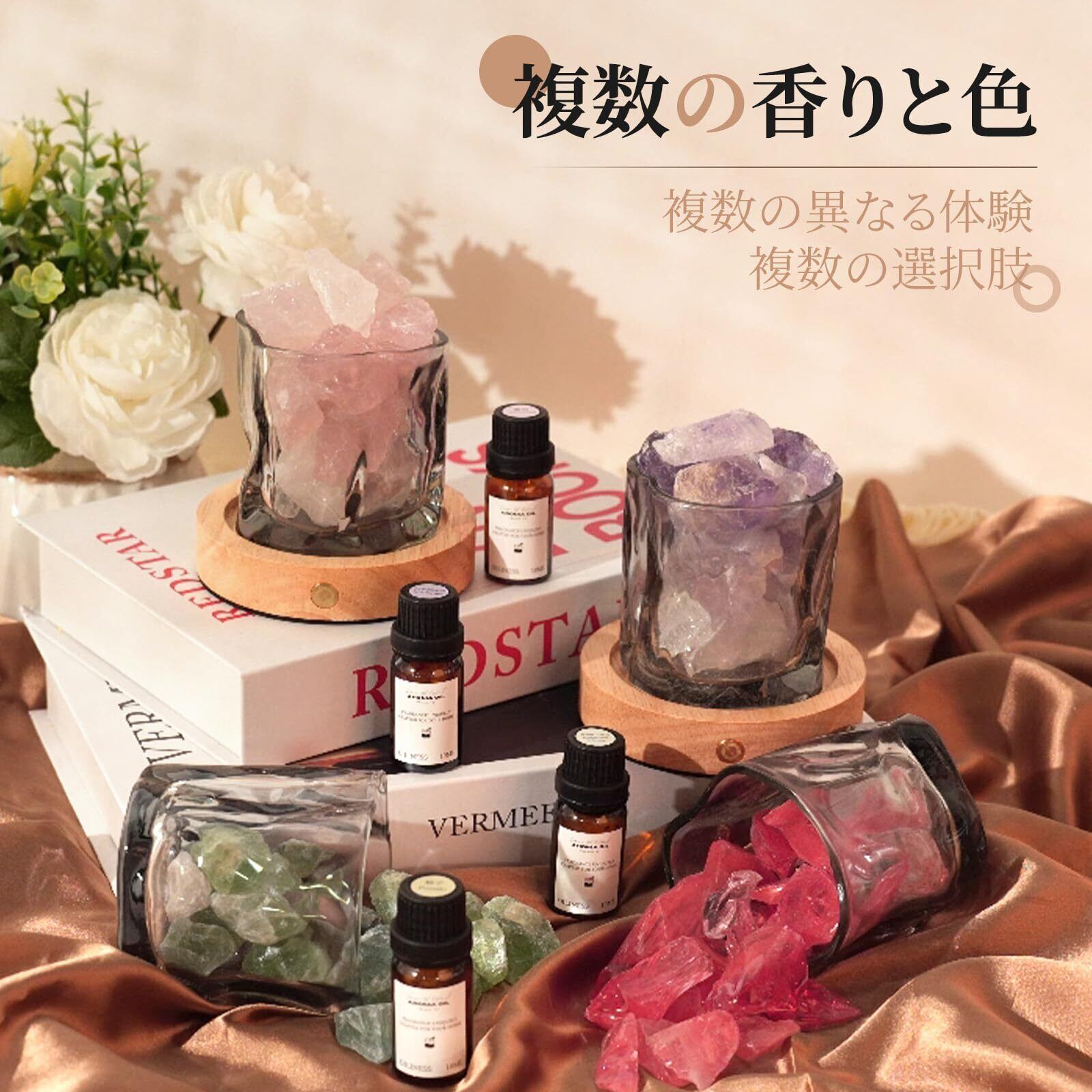 使用方法:クリスタルストーンとガラス容器は配送前に洗浄されていますが、輸送中のクリスタルストーン間の摩擦により、クリスタルストーンのくずの粉が発生し、カップとクリスタルストーンの光沢に影響を与えるため、使用前にクリスタルストーンとガラスを十分に洗浄し、最高のディスプレイ効果を得ることをお勧めします。 クリスタルは乾燥した方がより効果的です。巾着袋からディフューザーストーンを取り出し、デリケートなガラス容器に入れ、エッセンシャルオイルを数滴垂らし、クリスタルの隅々までオイルを浸透させます。異なる香りを混ぜることはお勧めしません。 ディフューザーを入れた容器は、木製の台座の上に置くことができます。 ベースの溝がガラス瓶をしっかりと支え、滑るのを防ぎ、より論理的で装飾的なデザインになります。