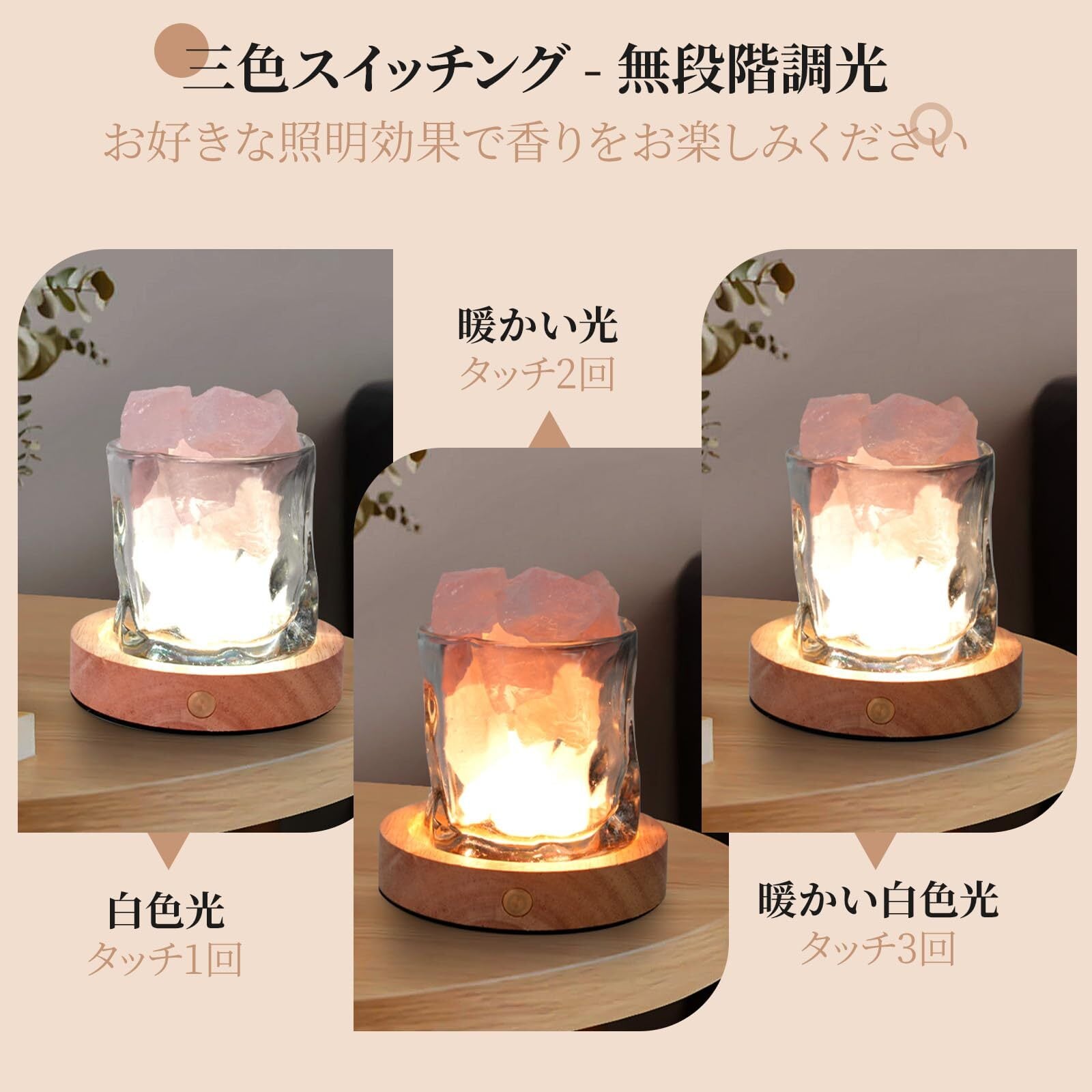 エッセンシャルオイルとチャージベースの使い方:強い香りがお好きな方は、一度に8~12滴のエッセンシャルオイルを、軽い香りがお好きな方は、一度に5~8滴のエッセンシャルオイルを加えてください。 室温はディフューザーストーンの揮発性に影響を与えます! 充電ベースはタッチスイッチで、使いやすく、3色のライトで様々な表示効果があり、長押しで明るさを調節でき、ライトが暗くなると即座に充電される。