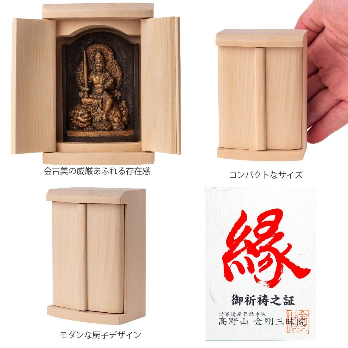 備考:※天然の木材を用いているため、湿度変化により本体重量が変化します。本製品は高野山金剛三昧院にて所願成就の御祈祷を賜っています。天然木のため木目等は選べません。尊像部はアンティーク調の金古美彩色でカスレなどを表現しております。