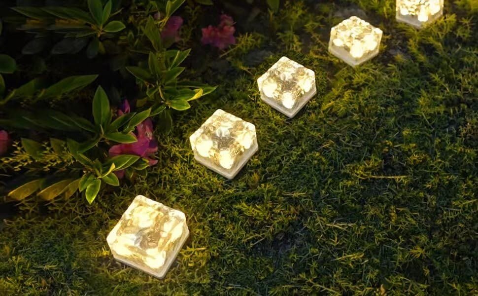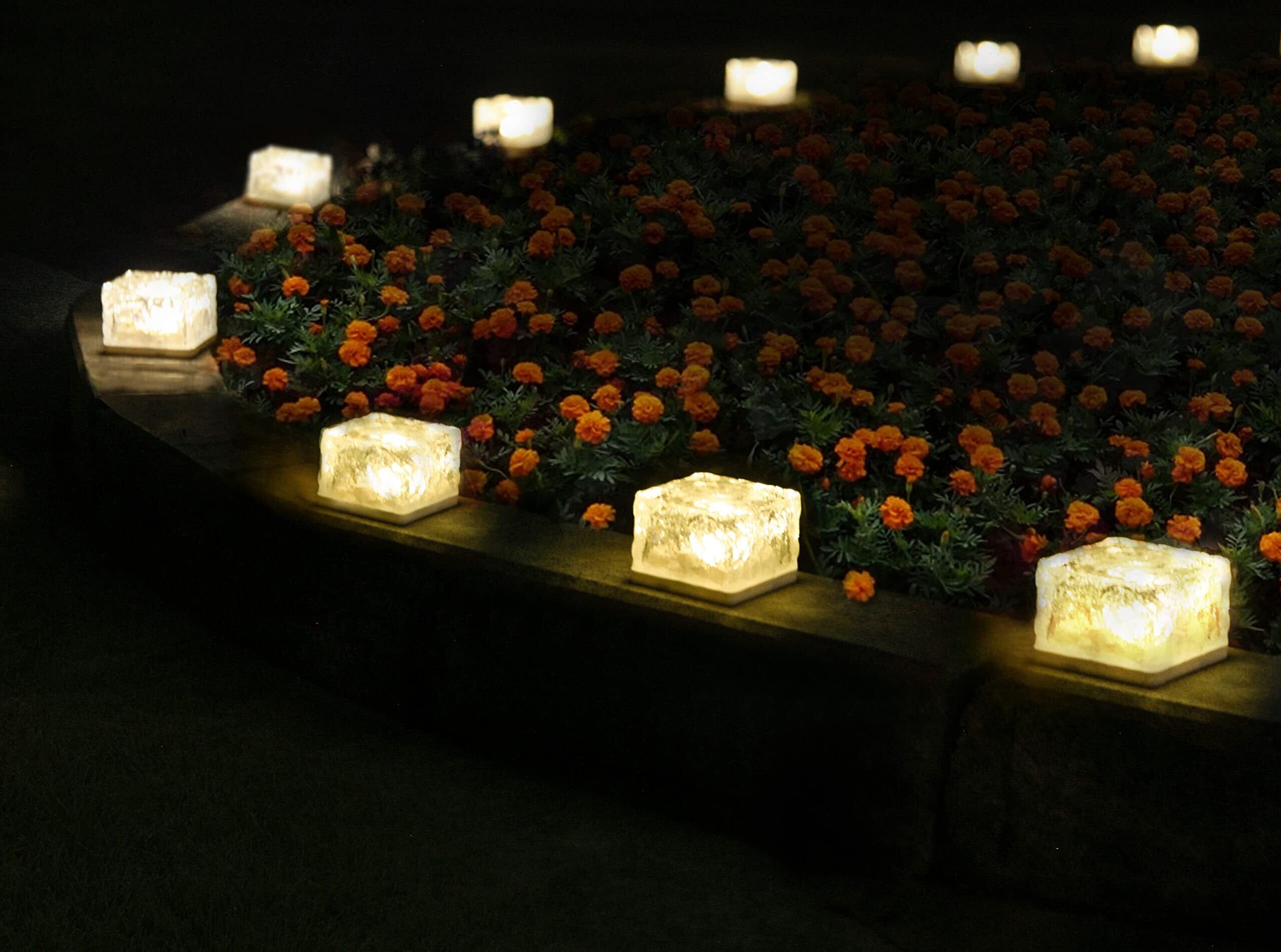 【特長1】自社製「ブリックアイス模様のソーラーライト」シャンパンゴールド風点灯色、幻のような光模様クリスタルガラス・ 埋め込み式ガーデンライト4個セット、電球色 華やかなガラス光!【 7cm角・埋め込み式ソーラーライト】電球色LED、耐久性に優れるクリスタルガラス、四季のガーデン装飾ライトとして最適!