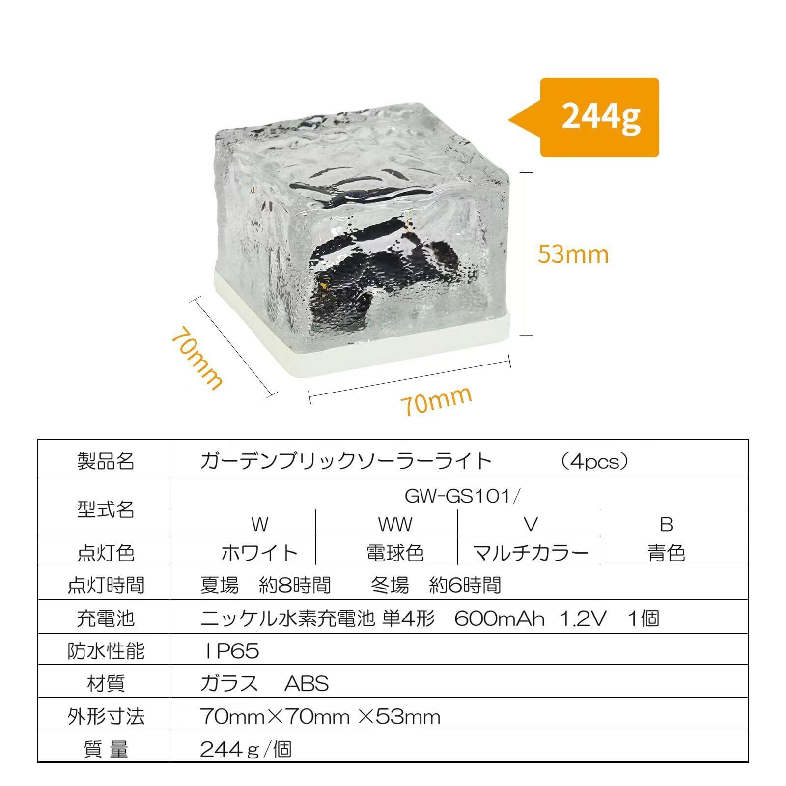 【仕様】点灯色:シャンパンゴールド、電球色LED4個(色温度3000K)、光センサーで夜間自動点灯。 点灯時間:フル充電後約8~10時間、防水規格:IP66、材質:ガラス、ABS、外径寸法:70㎜×70㎜×53㎜ 型番:GW-GS101WW (4pcs)