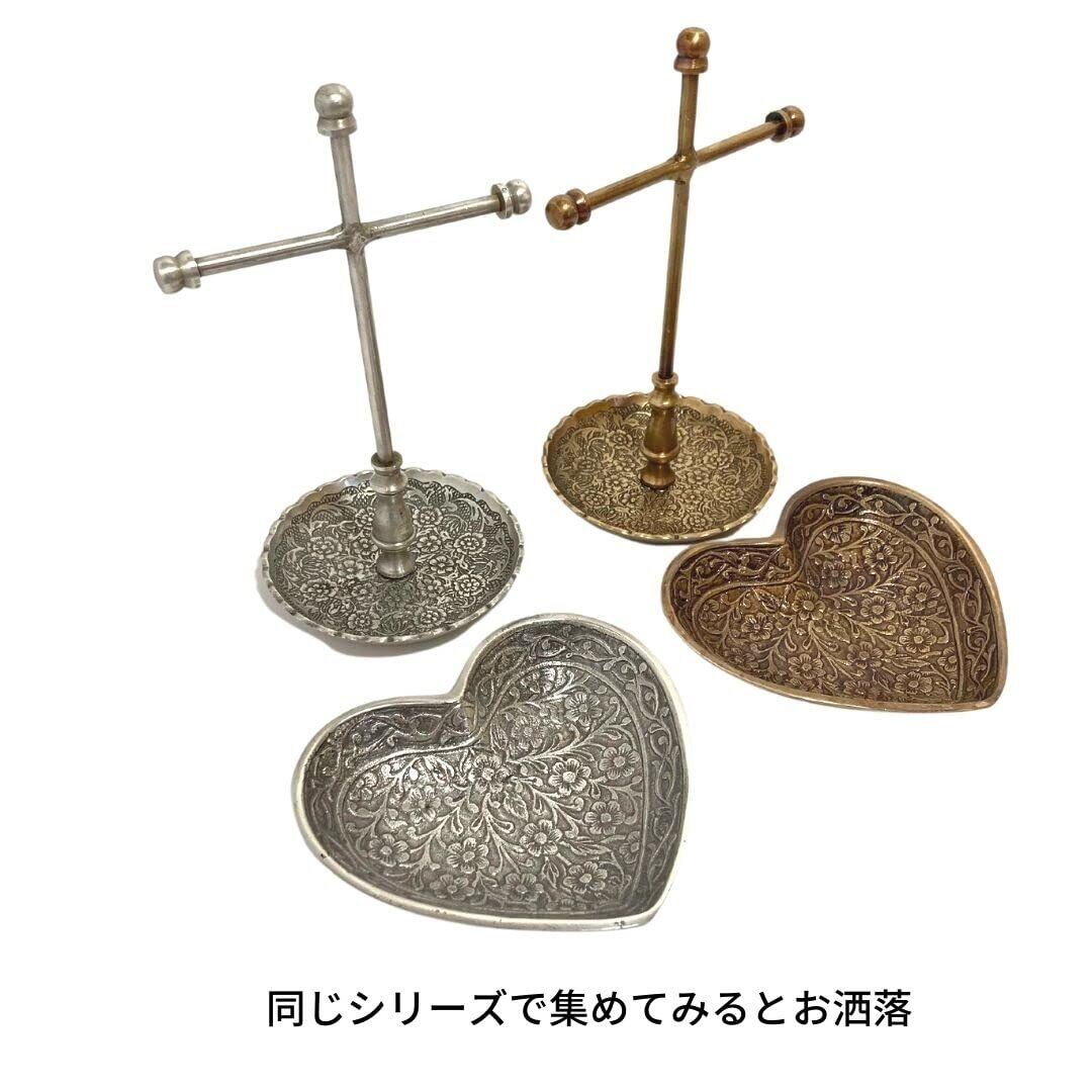 繊細な型押し模様が美しいインドの真鍮トレー。アンティークの様な雰囲気が高級感があって人気です。神秘的なイメージの月、ハート、イーブルアイのモチーフとアクセサリースタンドが仲間入りです。
