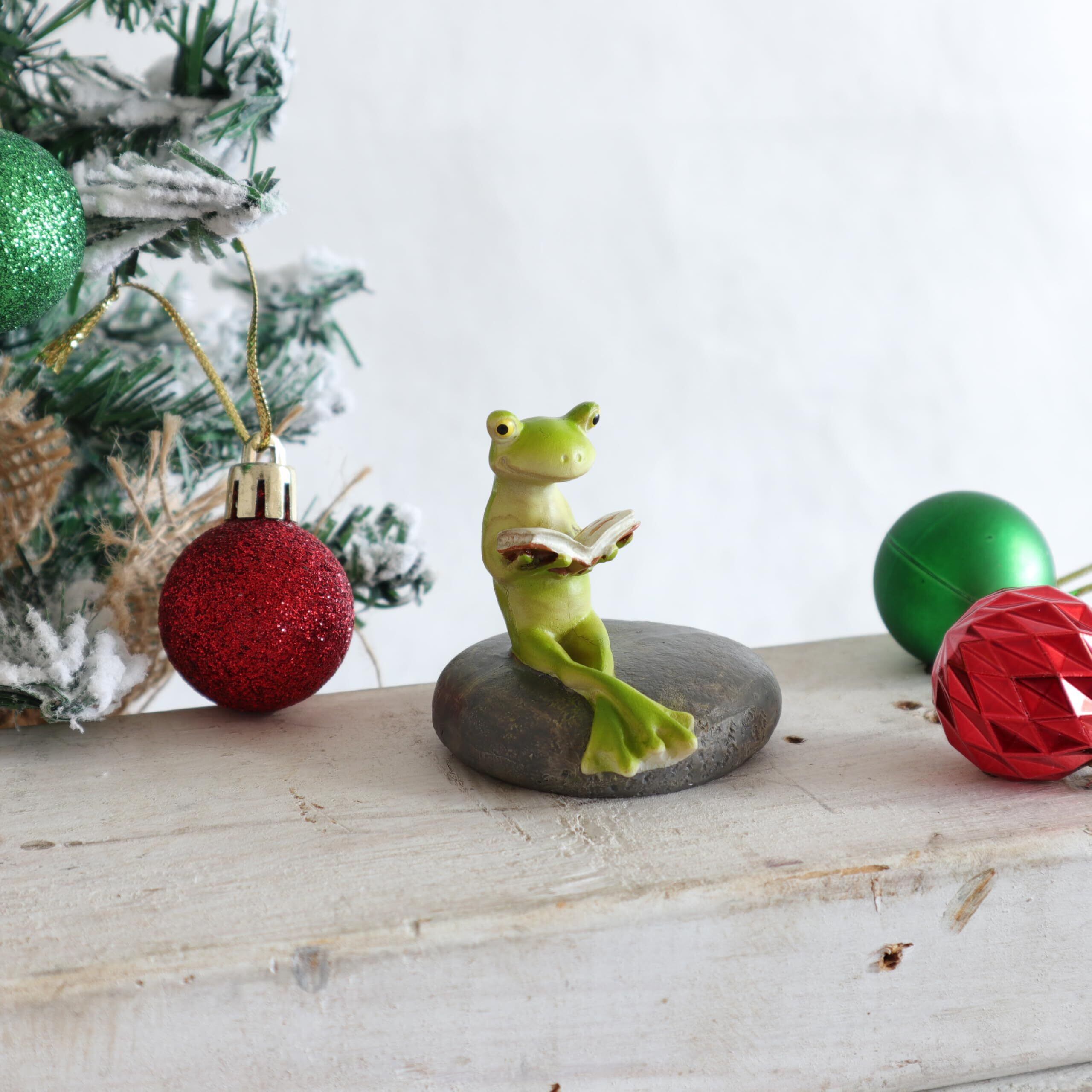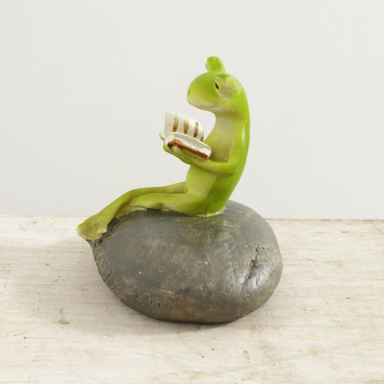 石の上で読書をしているカエルの置物(オブジェ)です。手のひらサイズでとてもかわいいですね!机の上に置いたり、家具やコンソール、出窓、又は玄関の棚の上にディスプレイするといいですね。