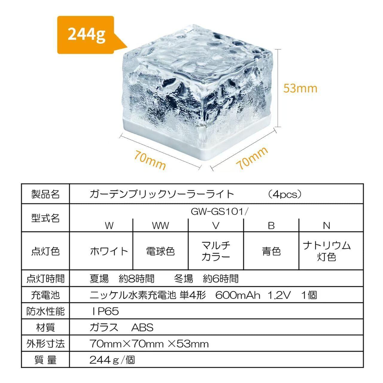 【仕様】点灯色:ナトリウム色、光センサーで夜間自動点灯。 点灯時間:フル充電後約6~8時間、防水規格:IP65、材質:ガラス、ABS、外径寸法:70㎜×70㎜×53㎜ 型番:GW-GS101/N (4pcs) 質量:244g/個