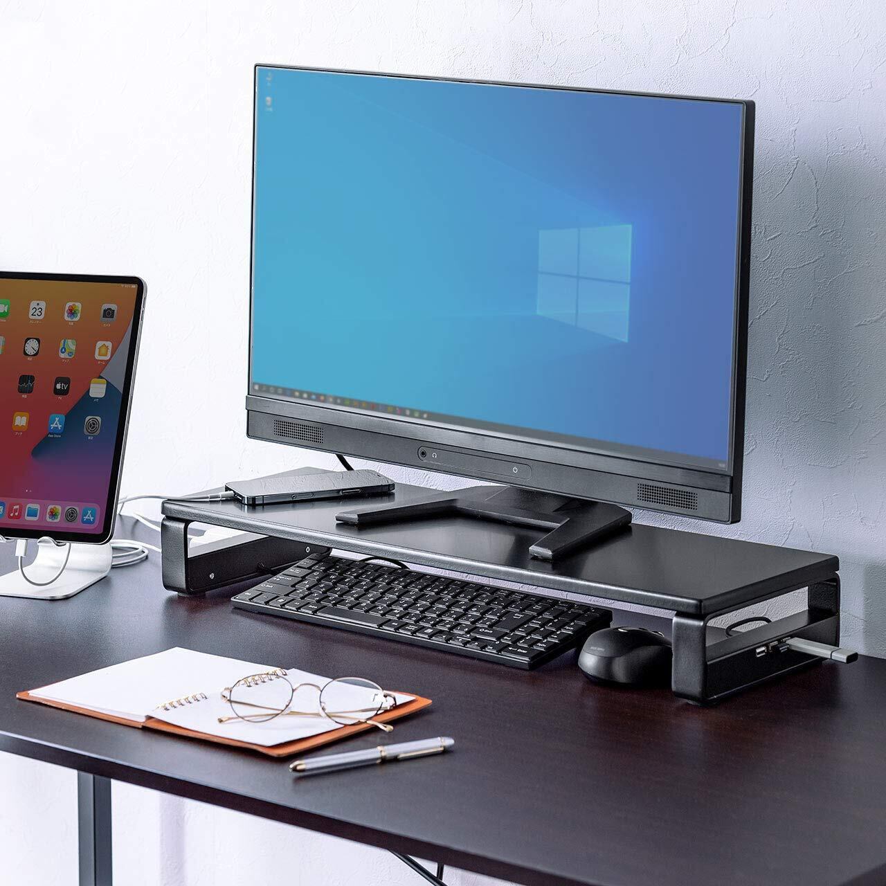 サンワダイレクト モニター台 USB 3ポート+電源タップ2個口付き 幅60×奥行20cm ブラック 卓上 100-MR039BK