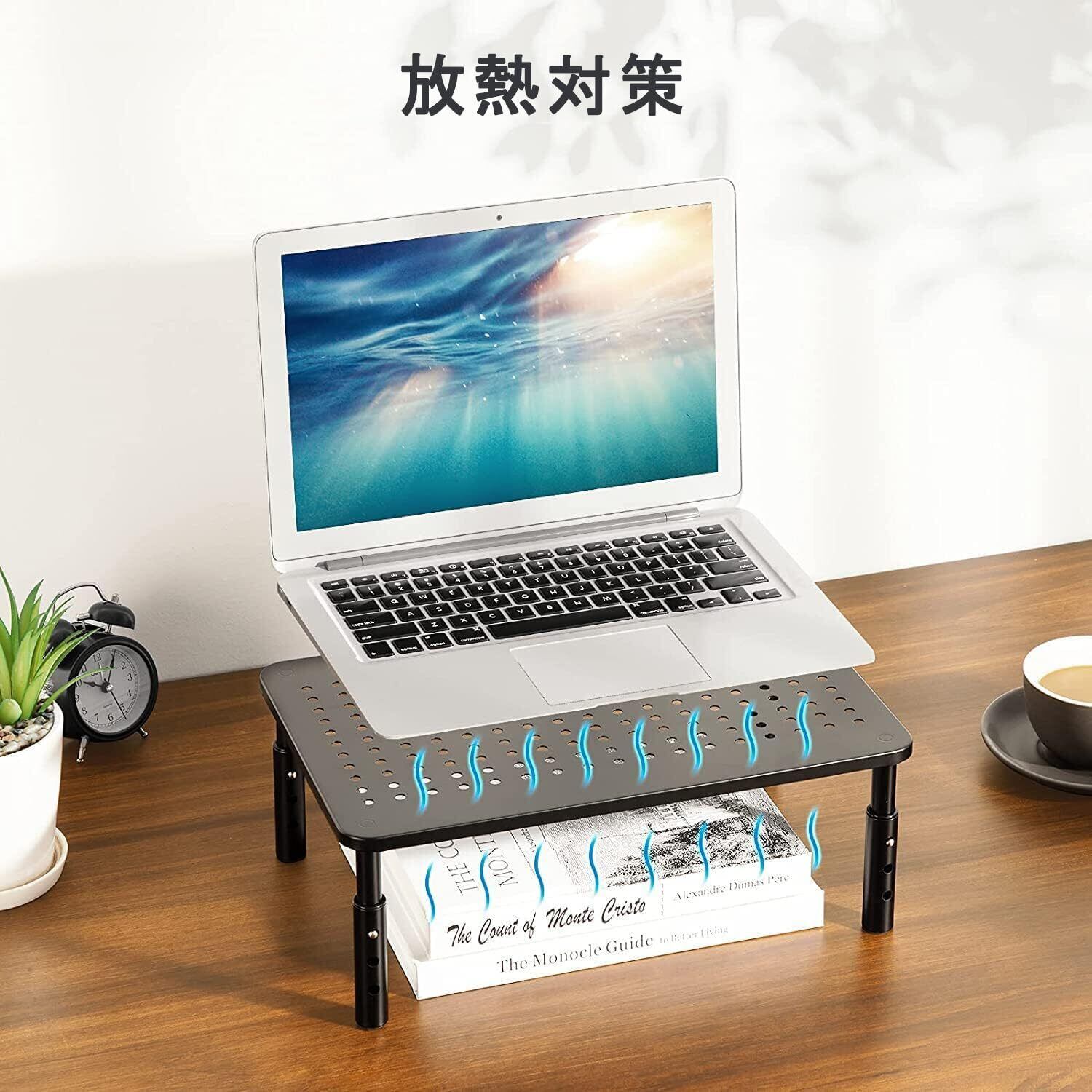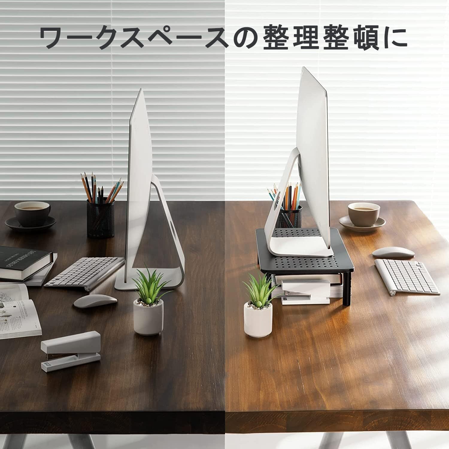 【猫背対策】机上台にモニターを設置することで、目線の位置を上げモニターを見やすくします。目の疲れや背中および頚椎のを軽減でき、作業効率も上がります。モニター台のほか、ノートパソコンや電話台・FAX台など様々な機器を設置できます。