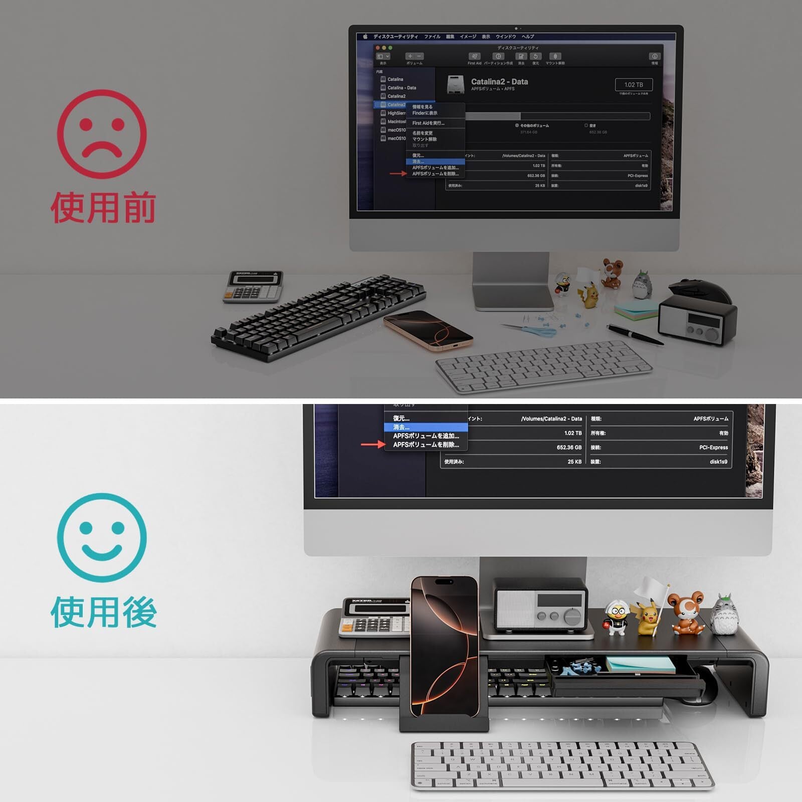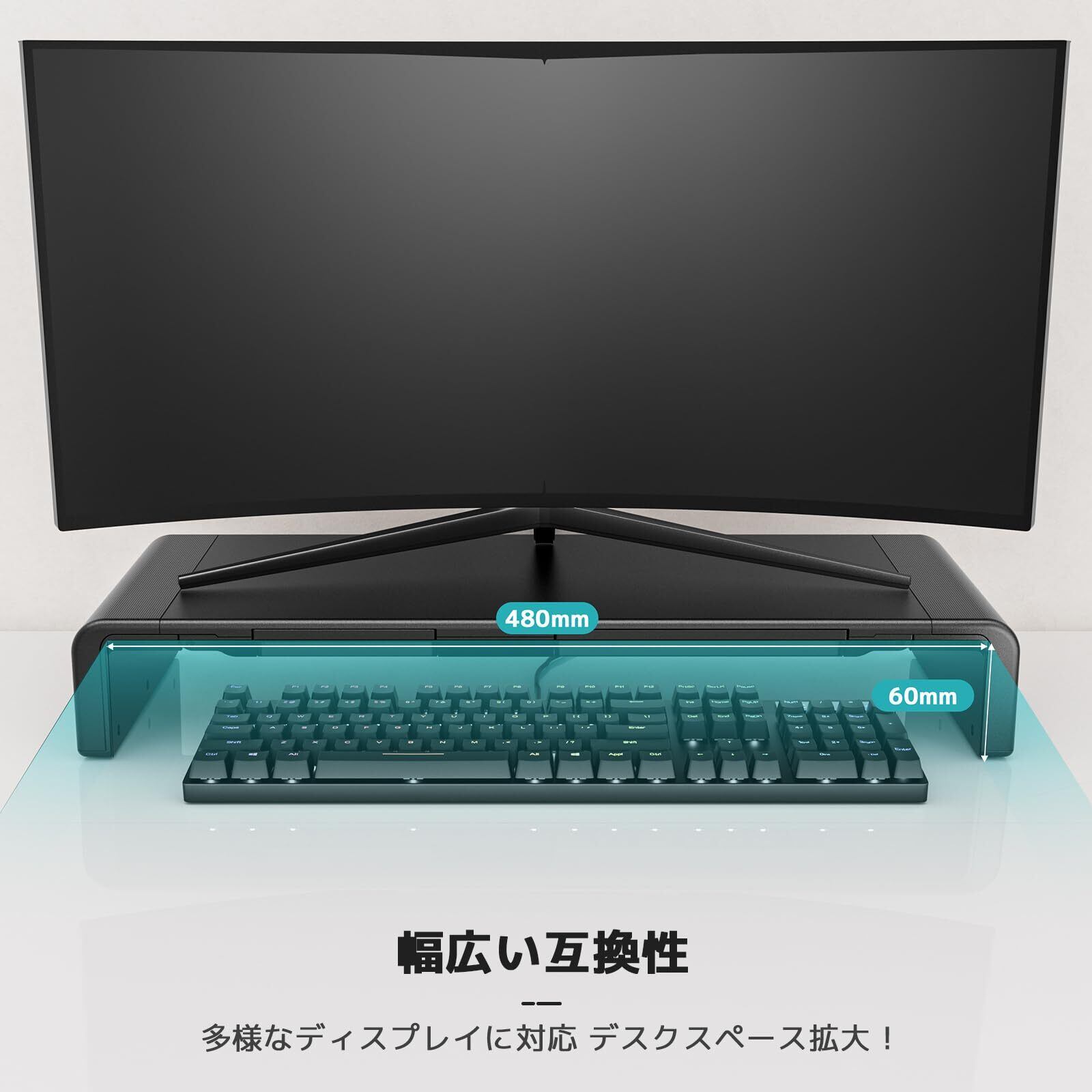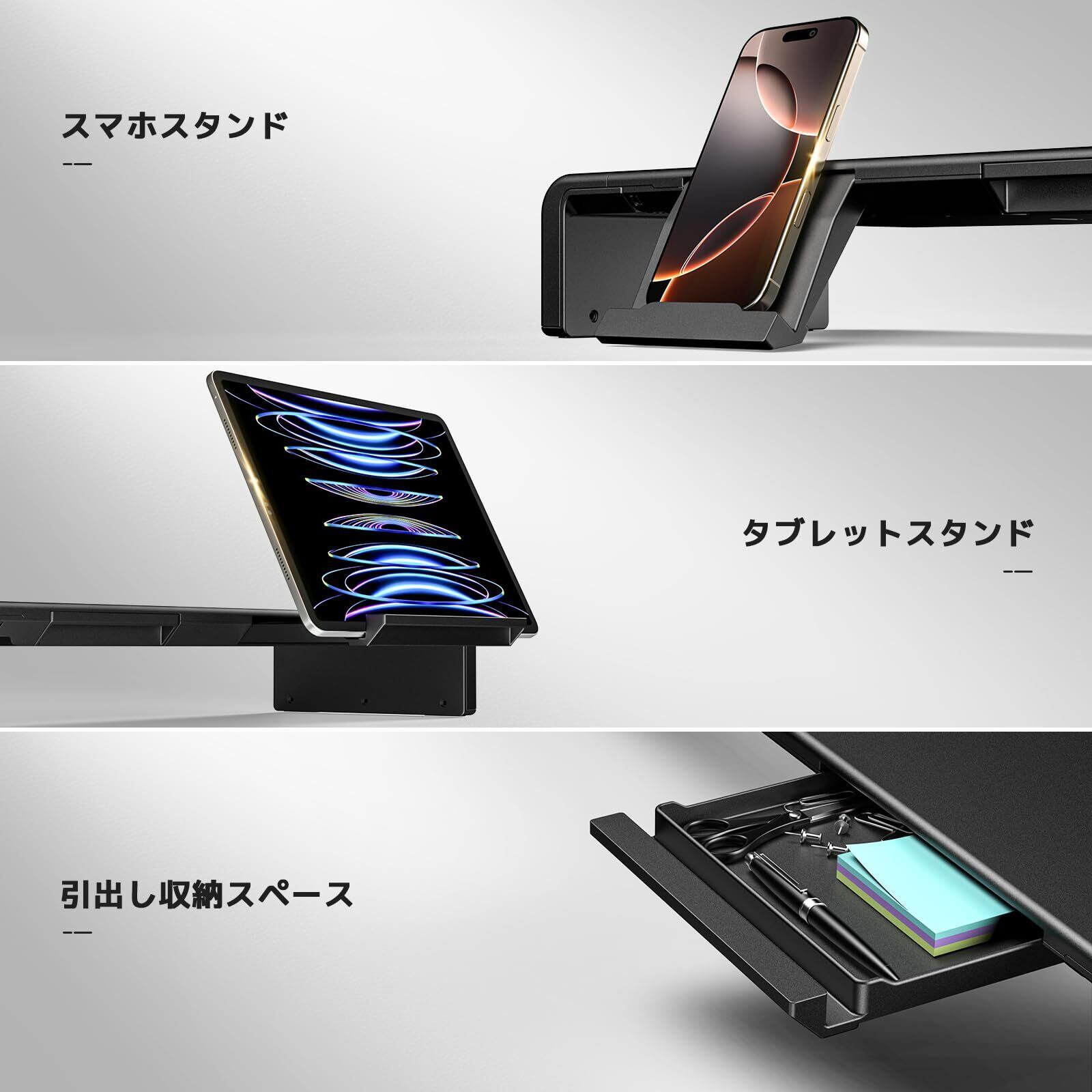 収納力抜群:モニター台の下にキーボードやマウスなどを収納できるスペースがあり、キーボードをホコリから防ぐことができ、デスクトップの作業スペースも広く取れます。引き出しやスマホホルダーも付いているので、オフィス用品を収納し、スマホやタブレットを置くことができます。