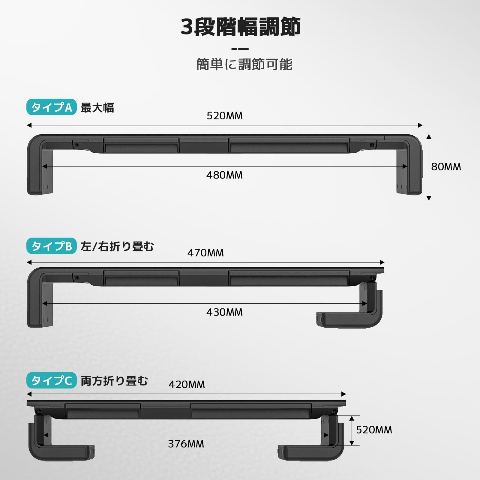 三段階の幅調整可能:お好きなように三段階-420mm、470mmと520mmの幅で調整可能できます。20.5インチ程度のワイドモニターも設置できます。
