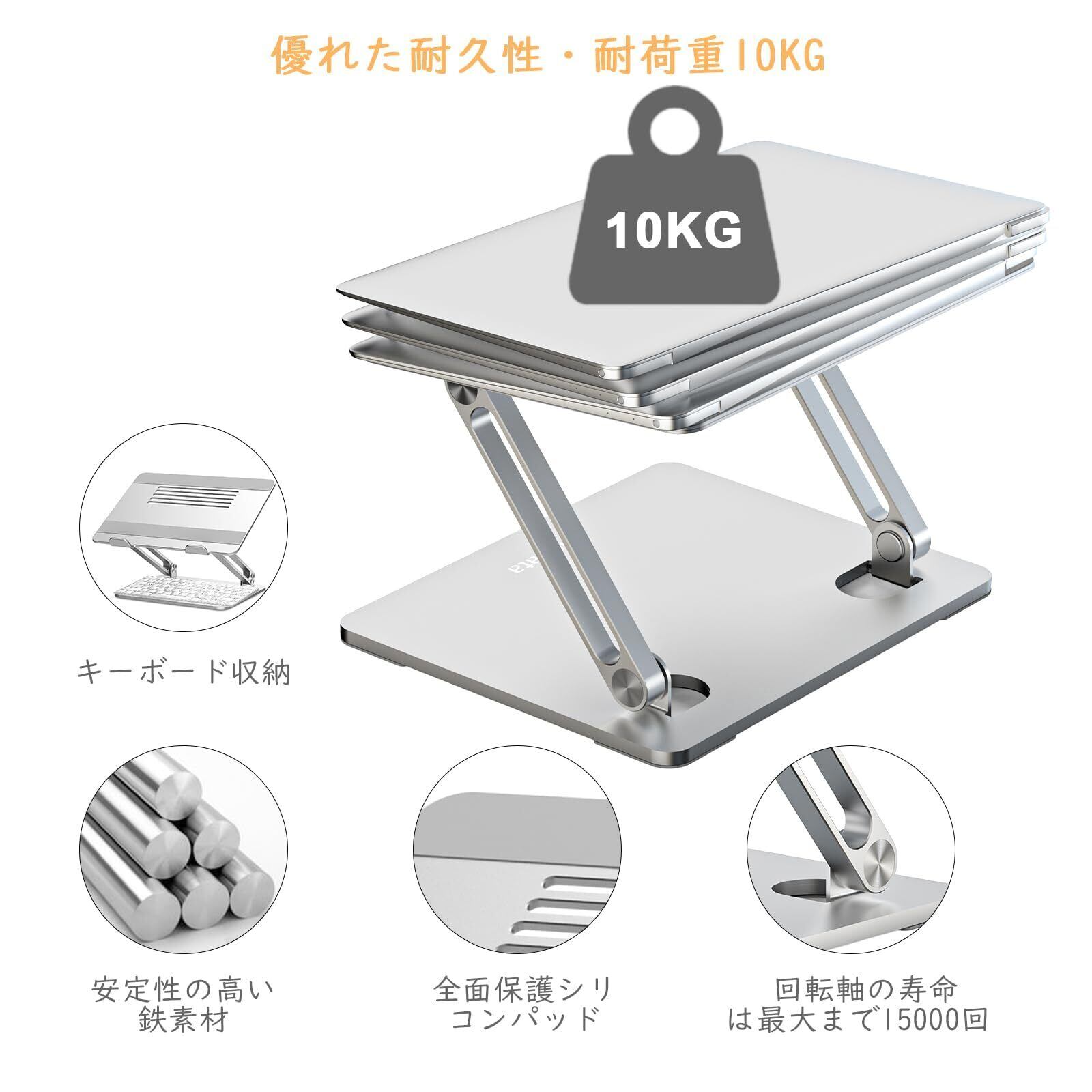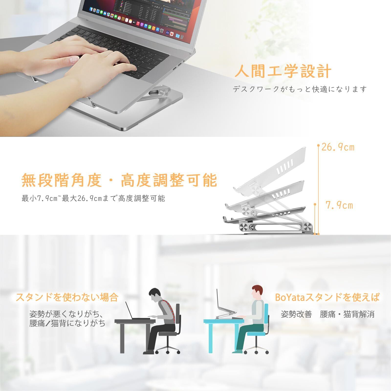 BoYata ノート パソコン スタンド PCスタンド パソコンスタンド 人間工学設計 安定性 無段階高さ調整 姿勢改善 折りたたみ式 滑り止め 炭素鋼素材 在宅勤務 15インチ以下対応 シルバー