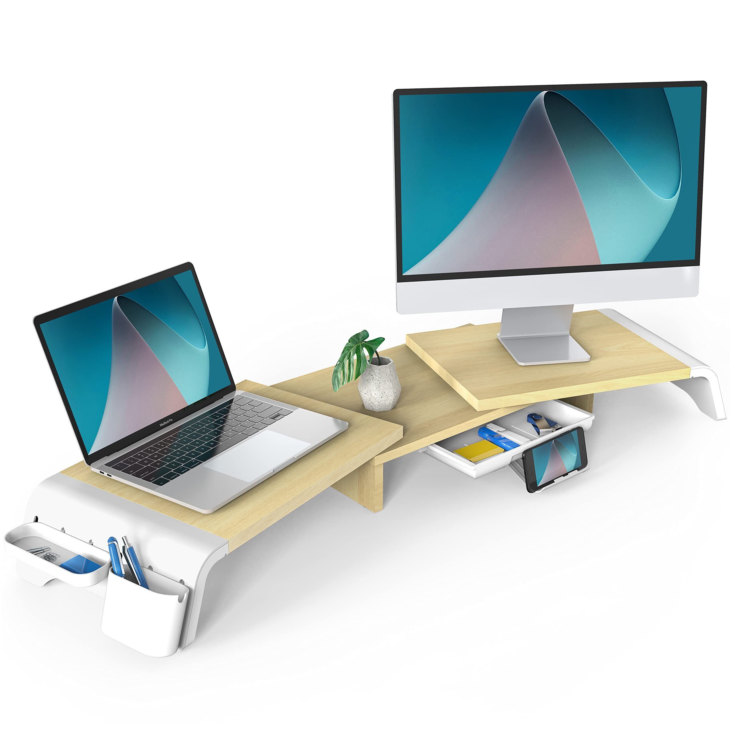 【在庫セール】Fenge モニター台 机上台 机上ラック 引き出し付き 74cm~107cm幅調整可能 木製 キーボード収納 組み立て簡単 耐荷重25kg モニタースタンド ノートパソコン台 卓上ラック ホワイトG04B1101C | paghag