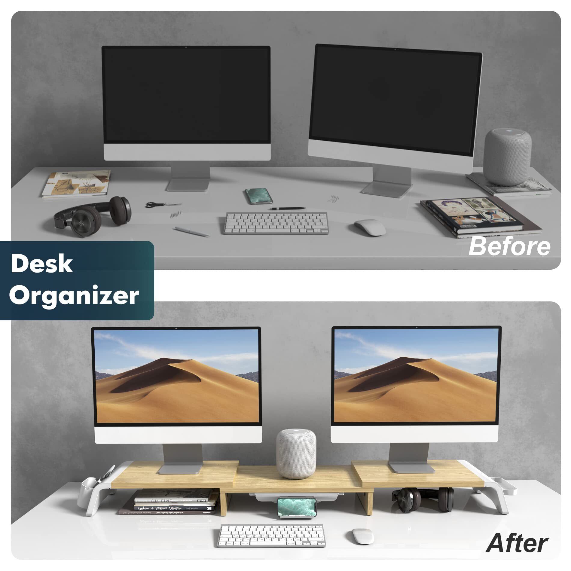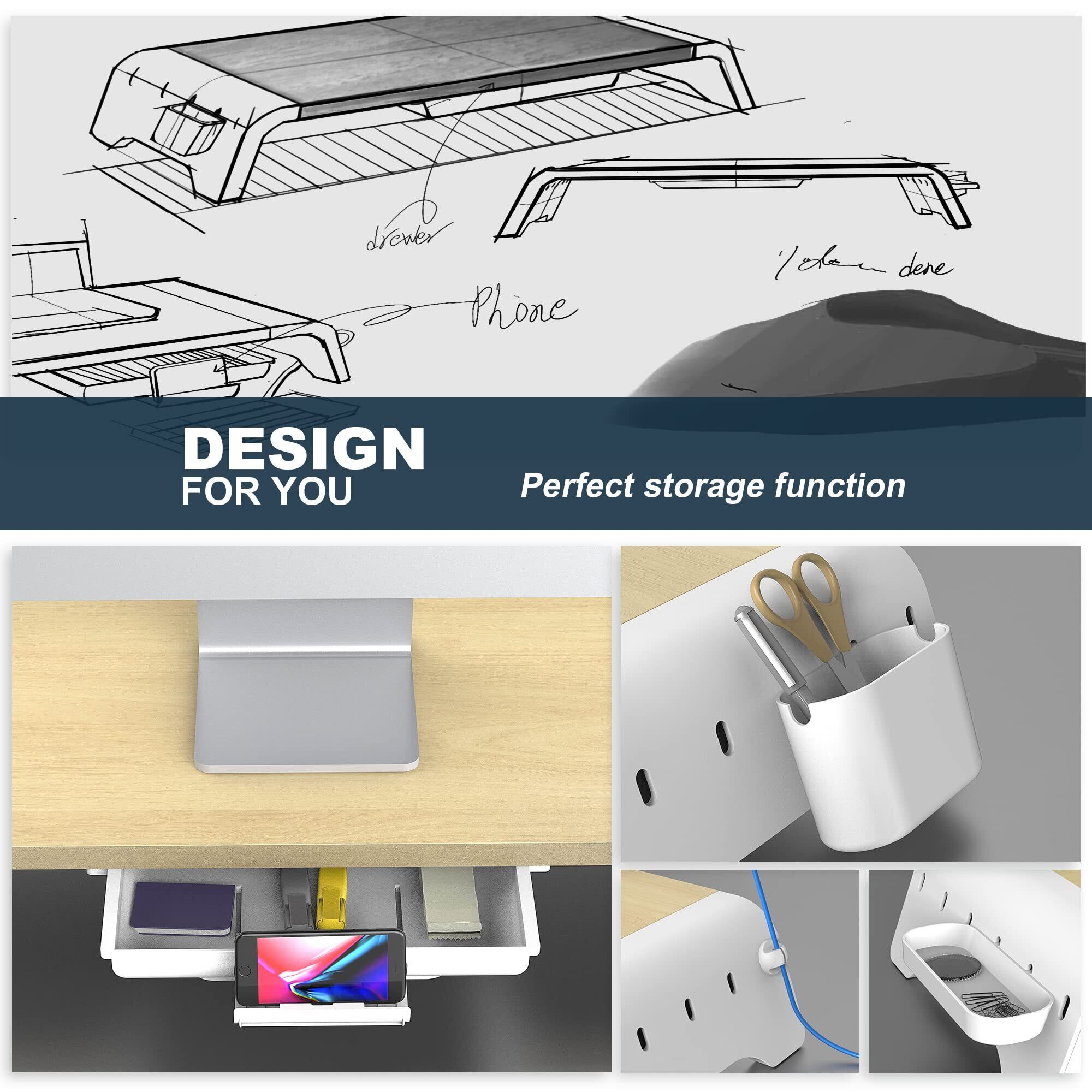 【収納たっぷり・ スペースを有効に活用】機能満載のモニター台に引き出しや収納ラックが付いているのでデスクトップやノートパソコンはもちろん、ペン、スマホ、ノートなどの文具小物やキーボード・マウスも一気に収納できます。デスクの周りはすっきりになれ、作業スペースも広めます。