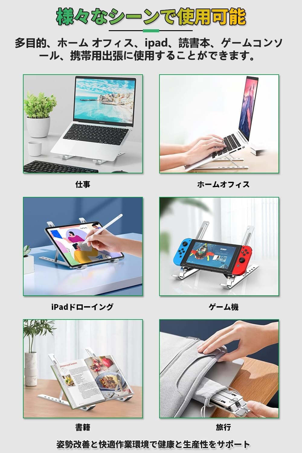 【優れた放熱性】ノートパソコンスタンドは熱伝導率の高いアルミ合金とシリコン素材で作られています、特別な中空設計により、放熱面積が最大限度に広げて、冷却スタンドとして放熱性も非常に良いです。熱い日にタブレットやノートパソコンを使いて長時間のテレワーク時に放熱重宝です。