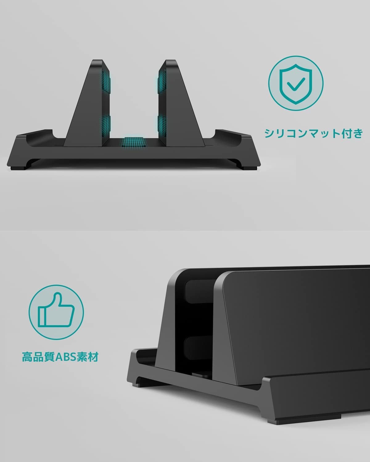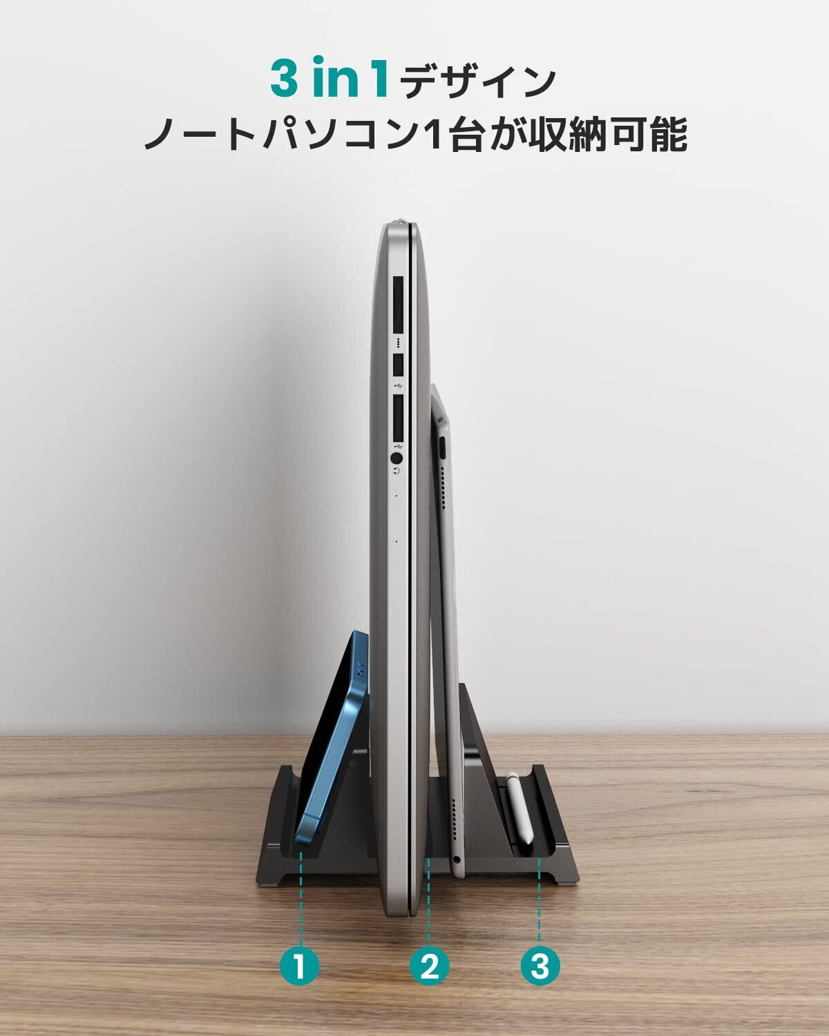 3-in-1ノートパソコンスタンド 縦置き KlearlookノートPCスタンド 卓上置き ノートパソコン1台収納 幅調節可能 六角レンチ付き 滑り止め 安定性 省スペース ABS素材 ブラック