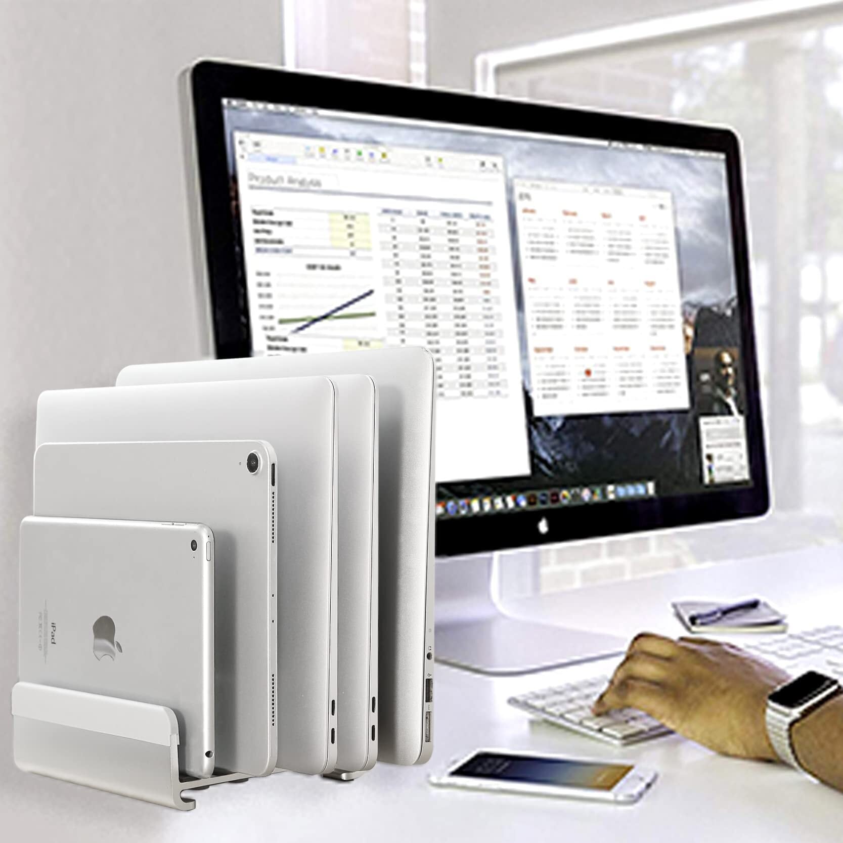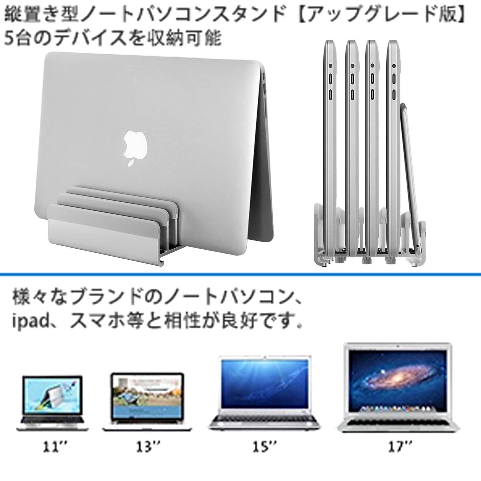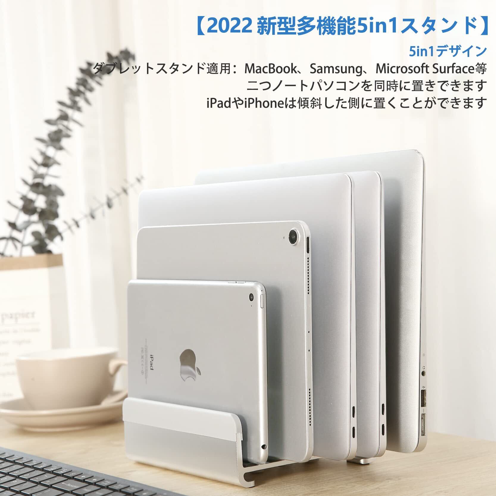 【在庫処分】縦置きで最大5台のデバイスを収納できるノートパソコンスタンド。幅は自由に調節可能で、素材のアルミニウムは、様々なブランドのノートパソコン、ipad、スマホ等と相性が良好です。MacBook Pro/Air/Microsoft Surfaceのすべてに対応し、新デザインを採用しています | paghag