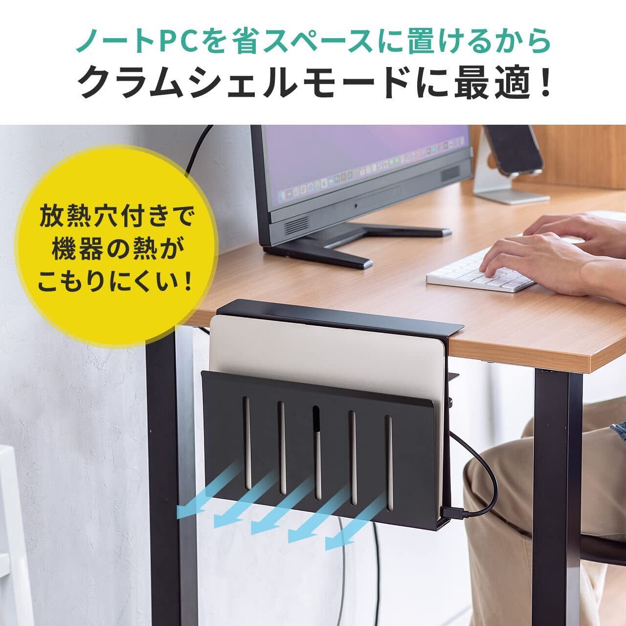ノートパソコンをクラムシェルモードで使用する場合にデスクスペースを広く使えます。また、放熱穴付きのため、機器の熱がこもりにくいです。