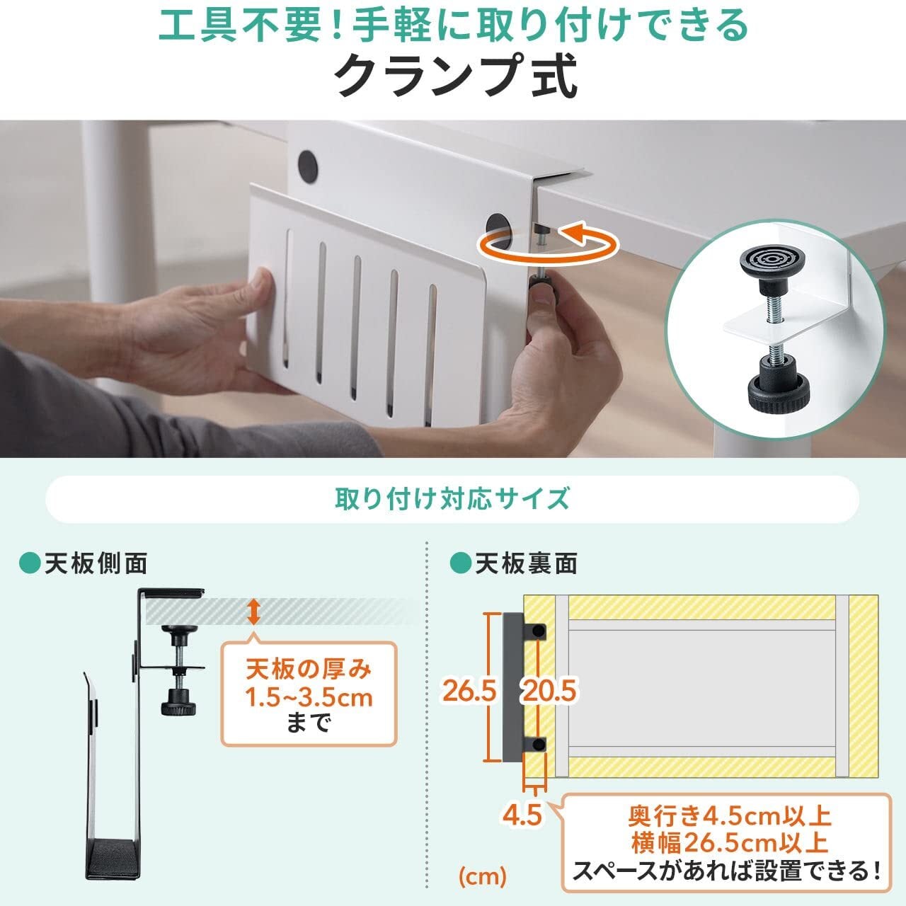 工具不要で簡単に取り付けができるクランプ構造。デスクに穴開けなどの加工の必要はございません。クランプは厚さ3.5cmまで対応します。