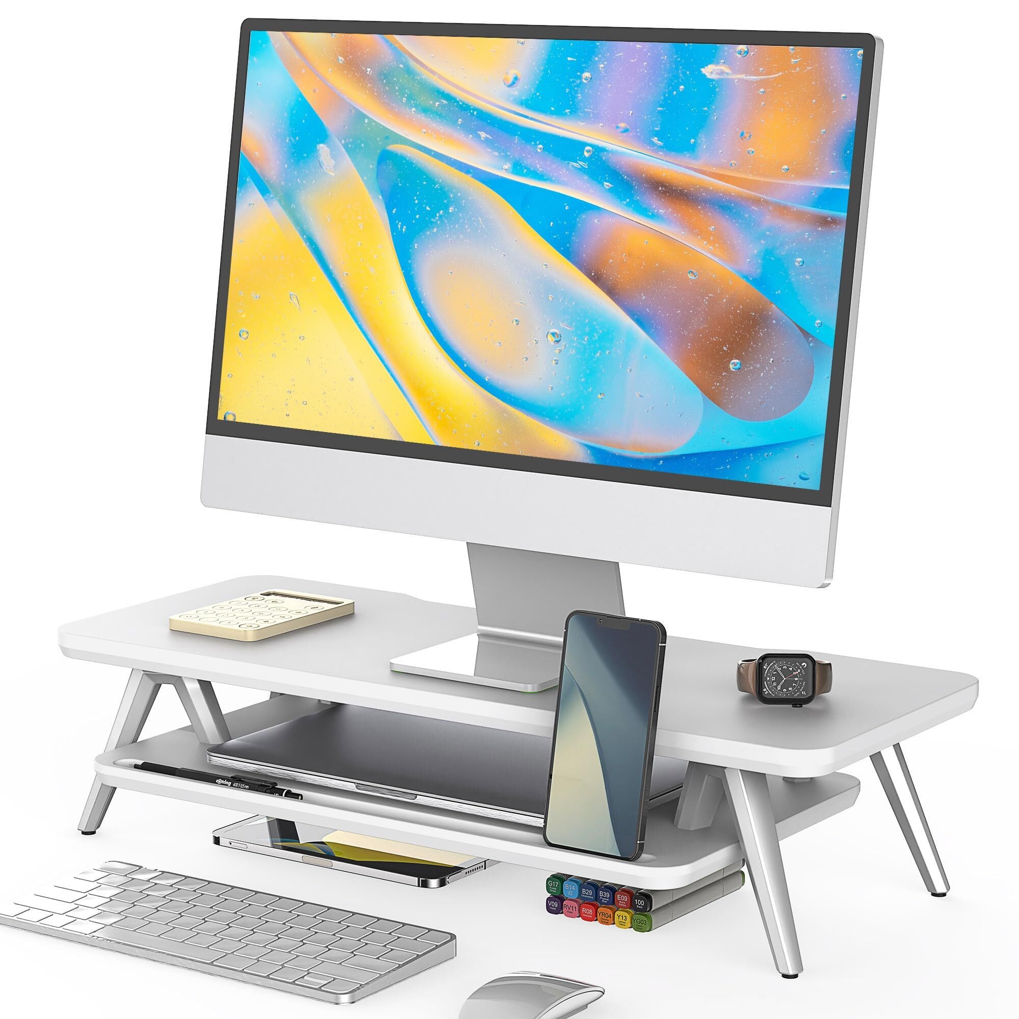 Fenge モニター台 卓上 机上台 パソコン台 机上ラック 60cm横幅 2段 パソコンスタンド木製天板 アルミニウム製脚 デスクトップ用 机上 モニタースタンド 机上台 pc台卓上モニター台 パソコンラック 卓上 収納 整理整頓ホワイトG04A2061A