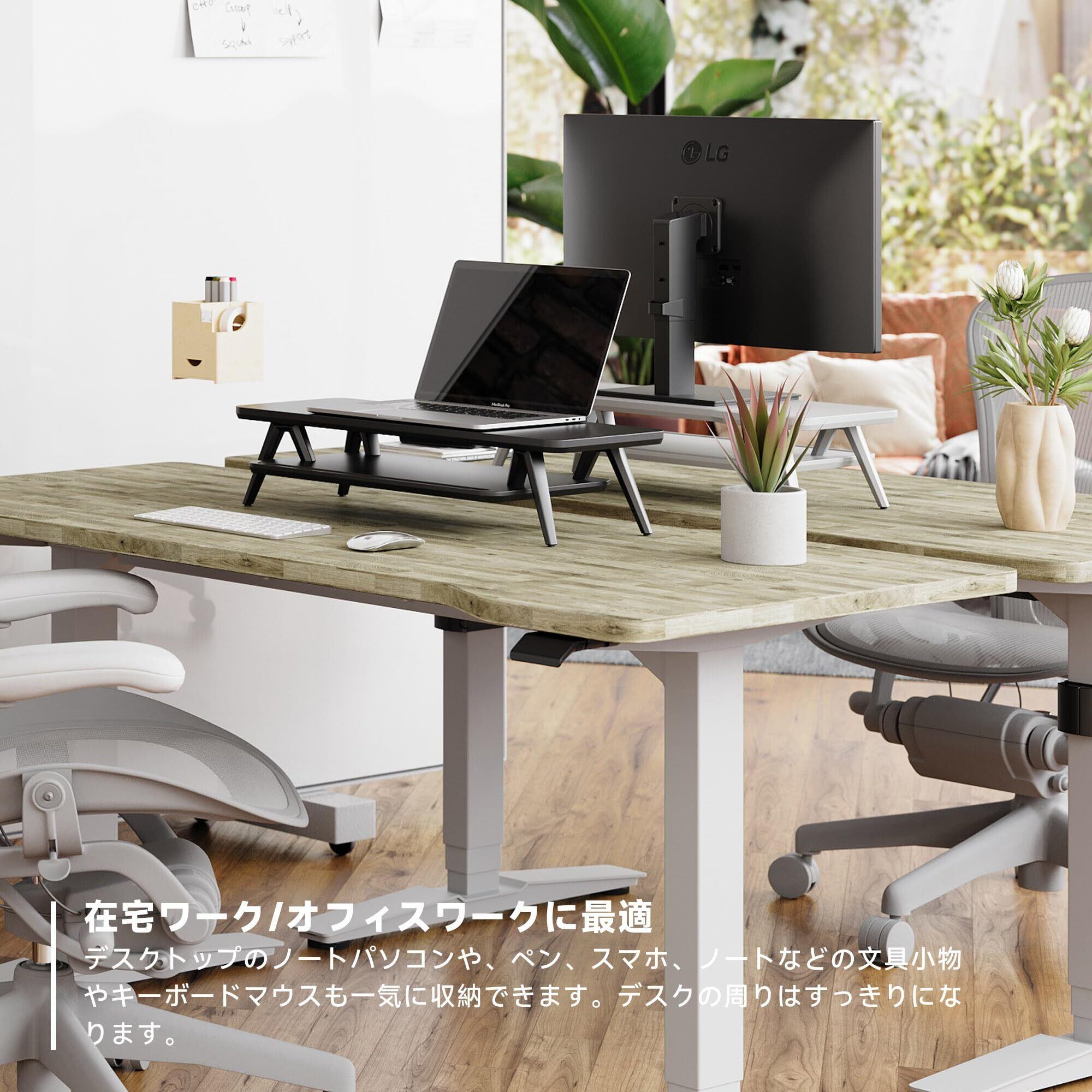 【人体工学設計&猫背対策・作業率アップ】:デスクの上置棚にモニターを載せることで目線が約14cm高くなり、自然と首や背筋が伸びるようになります。正しい姿勢を良くキープしながら、健康なワークスタイル変革に!テレワークの作業効率化と整理整頓にも役立つアイテムです。