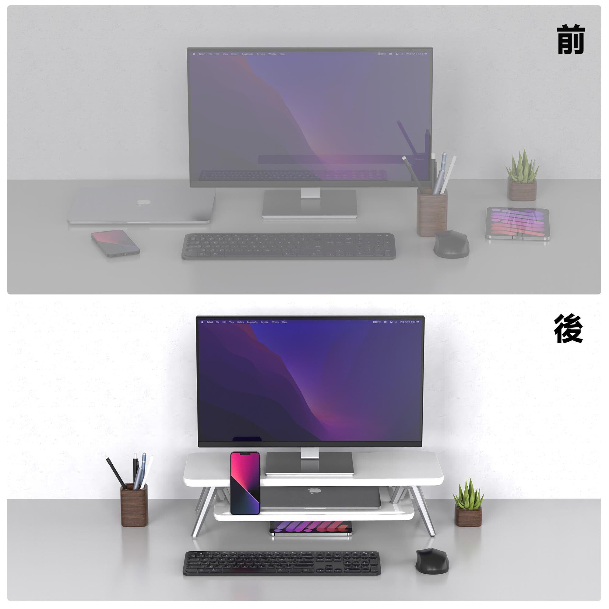 【収納プラス・デスク上をすっきり】:モニター台2段式で上段はスマホやタブレットやノートなどをすっきりに収納できます。 下段の空間を活用して、キーボード、マウスなどの周辺機器を整理し、デスクを広くご利用いただけます。