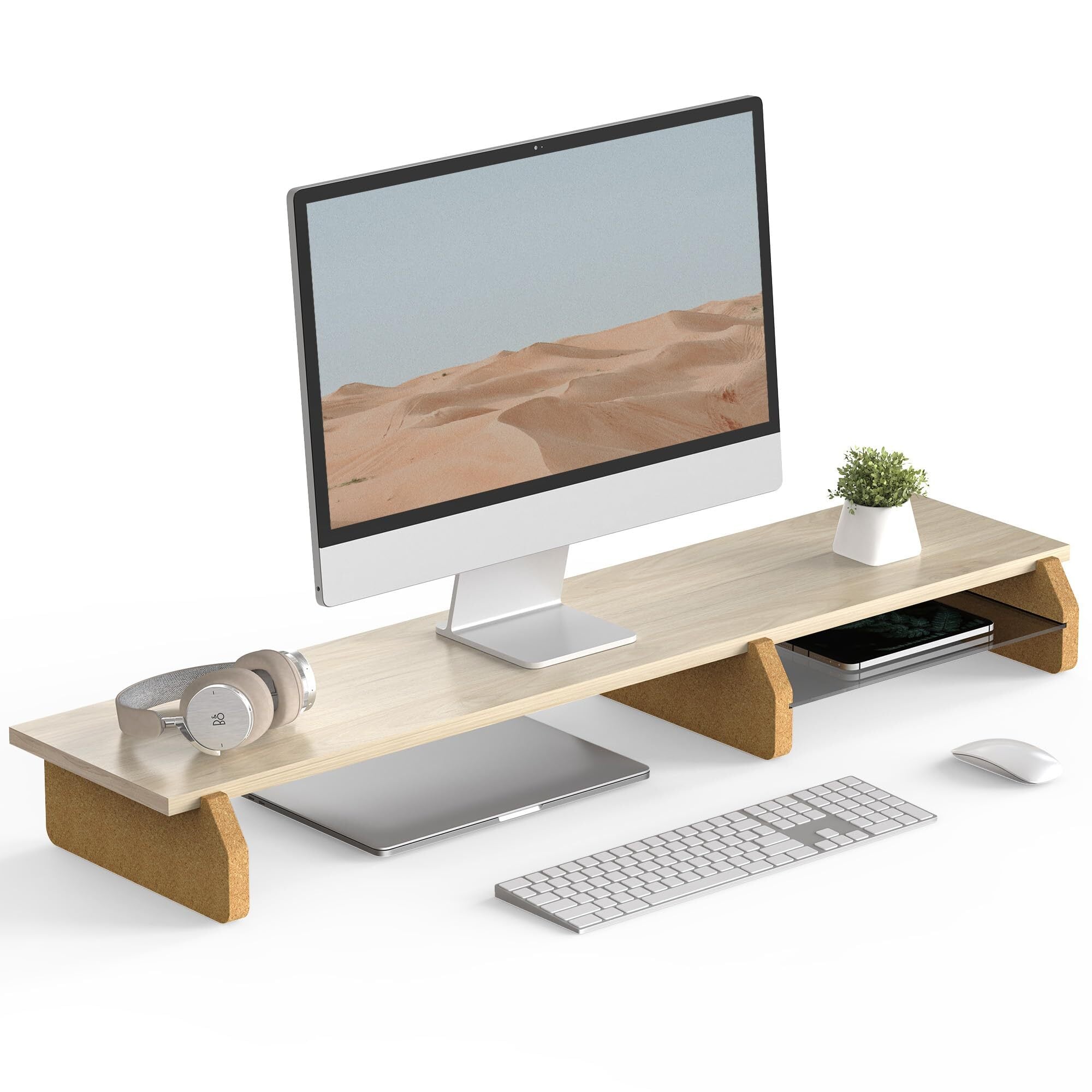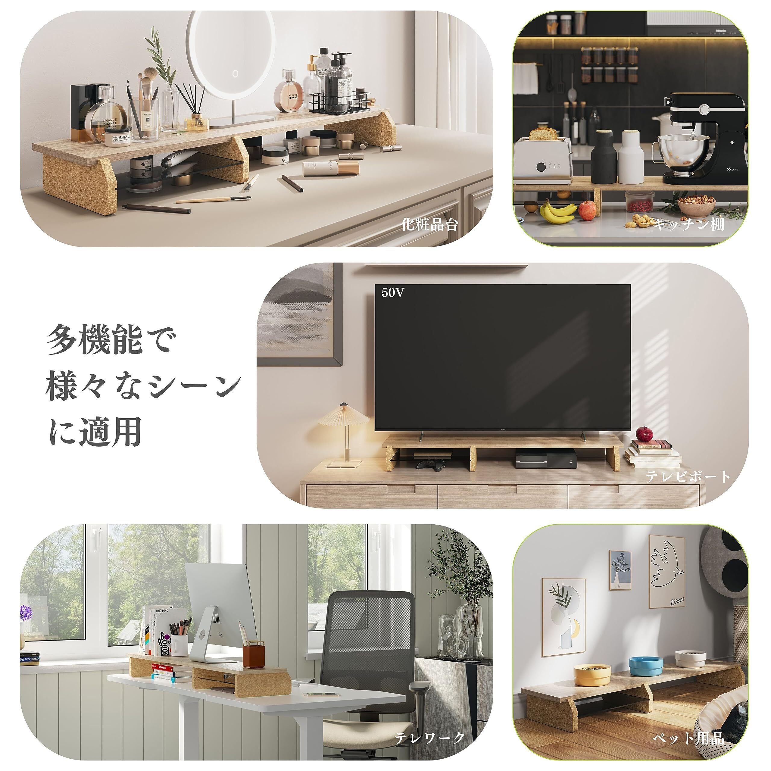 【環境に優しい材質 ・安全安心】こちらのパソコン台の材質は通常販売しているモニター台の材質と違って、コルクから作られる足が環境に優しく、衝撃による痛みを軽滅するのはもちろん、滑りにくく、しっかりと天板を支えて安定しています。天板にはパーティクルボード製で水や汚れがあっても拭くだけでOK。