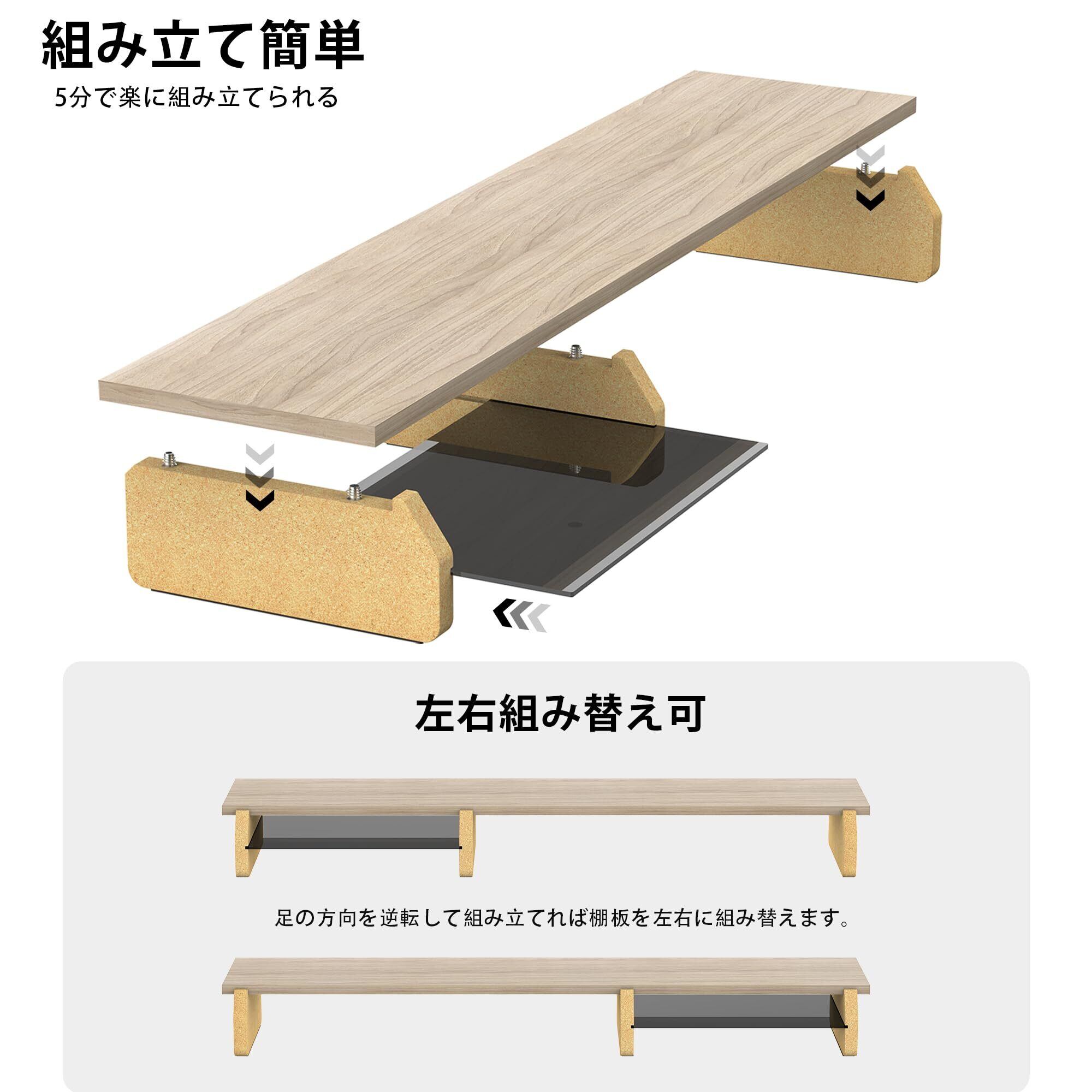 【棚板を左右に組み替える可能・使用便利】モニター台の棚板はお客様のご利用習慣によって左右どちらにも組み替え可能です。足の方向を逆転して組み立てれば棚板を左右に組み替えます。