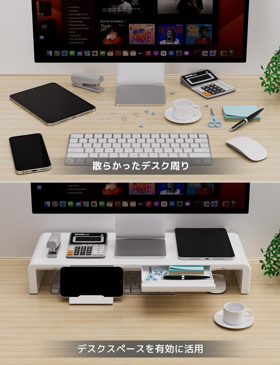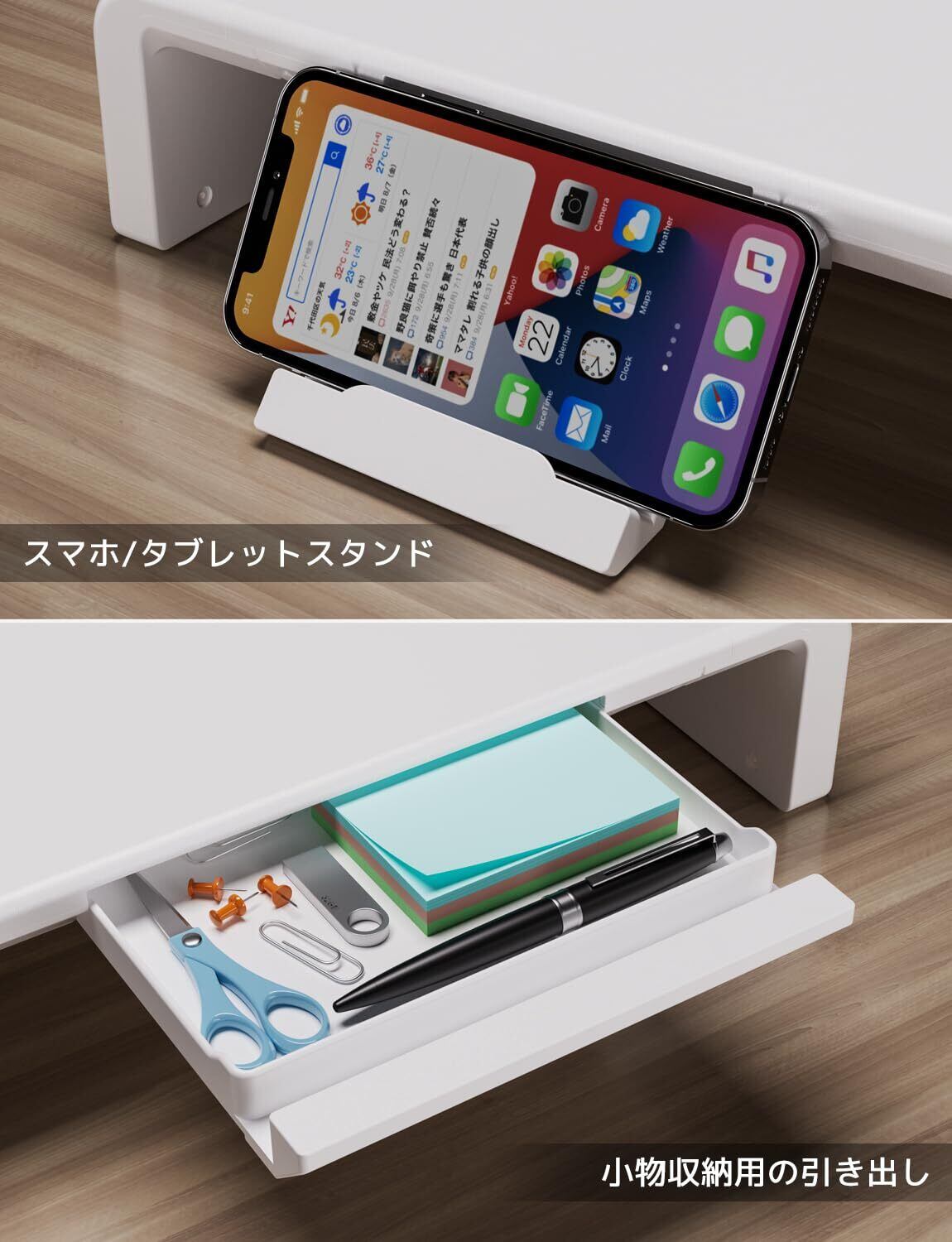 【スマホ&タブレットスタンド付き】引き出し式のスマホ立てを採用し、かつタブレットは小物入れのスロットに立てることができて、使わないときもきちんと閉めて、場所を取りません。モニター、スマホ、タブレットはいずれも見やすい位置に配置できて、マルチデバイスによって作業が捗ります。
