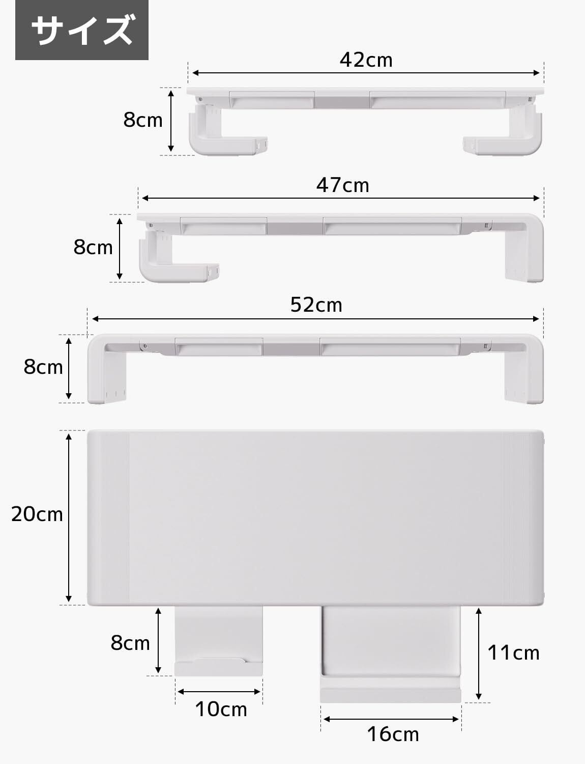 【3段階幅調節可能】両サイドの脚を折りたたんで幅を調節するタイプで、合わせて3種類の幅(42cm/47cm/52cm)が設定可能で、様々なデスク環境に対応できます。滑り止め用のシリコンパッドが付いており、安定感たっぷりです。 【人間工学デザイン】モニターを目線の高さに上げることで首や肩の負担を軽減して、ストレスを和らげて正しい姿勢をキープし、長時間作業の疲れから解放してテレワークを効率よく行います。