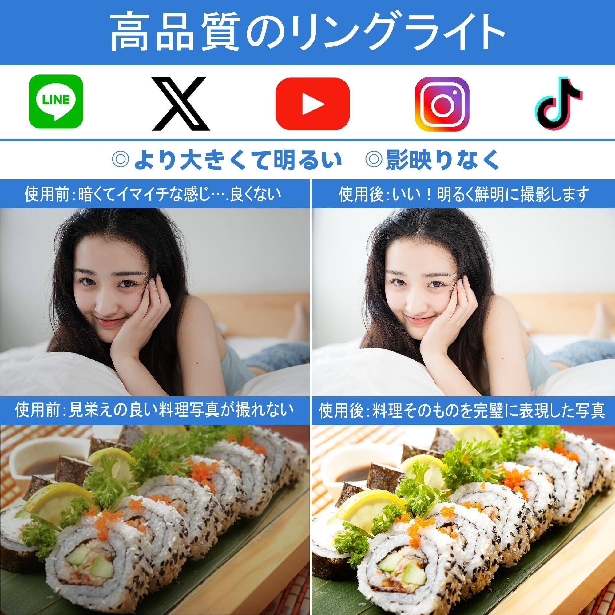 【より美しくなりたい】リングライトは、撮影、配信ライブ、照明、Zoom会議、女優、自撮り、テレワーク、リモート、オンラインワークなど、様々な使用シーンで大活躍。照明によって自分の肌を写真や動画でより白く美しく見せたい人に最適です。24ヶ月ブランド保証:お客様に信頼される会社となることを目標として日々努力しております。弊店の商品には2年間の保証期間がございます。期間中に万が一商品に何か問題がございましたら、いつでも弊店にご連絡ください。弊社は24時間体制で日本語サポートを提供しておりますので、安心してご購入ください。