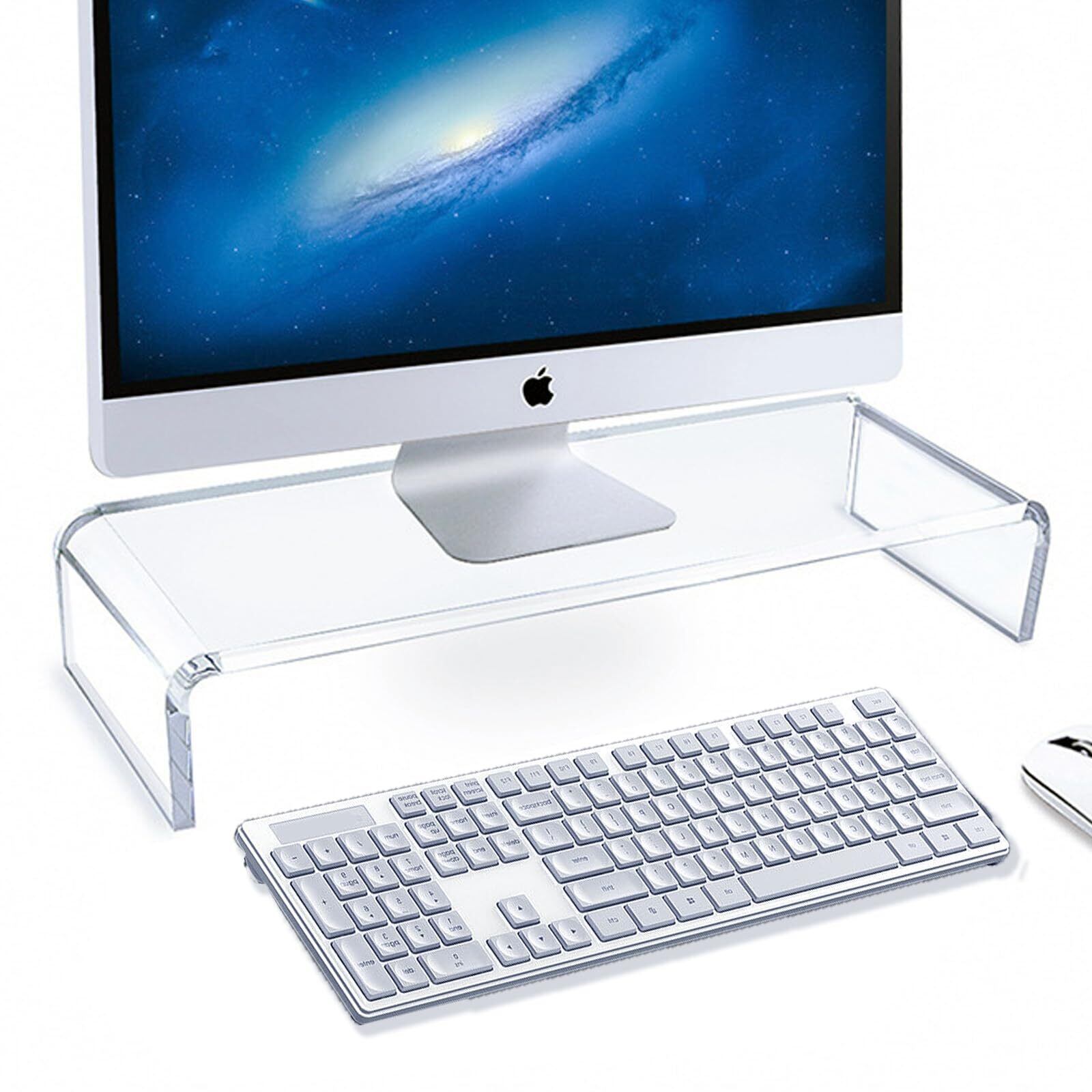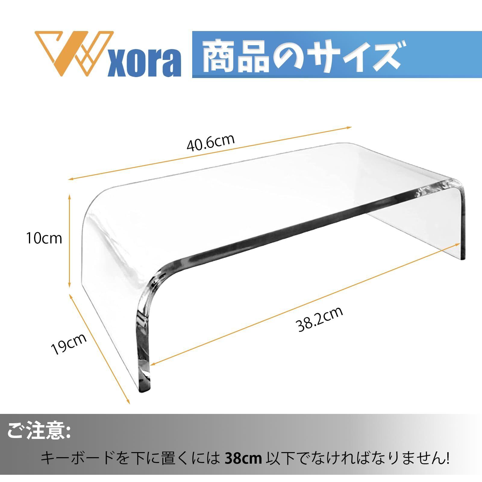 【商品仕様】アクリル製モニタースタンドです。幅40.6cm x奥行19cm x高さ10cm。アクリル厚さ:約1cm。透明なアクリルスタンドですので、様々なデコレーションスタイルに合わせることができ、コンピュータセットアップ全体を魅力的に演出します。