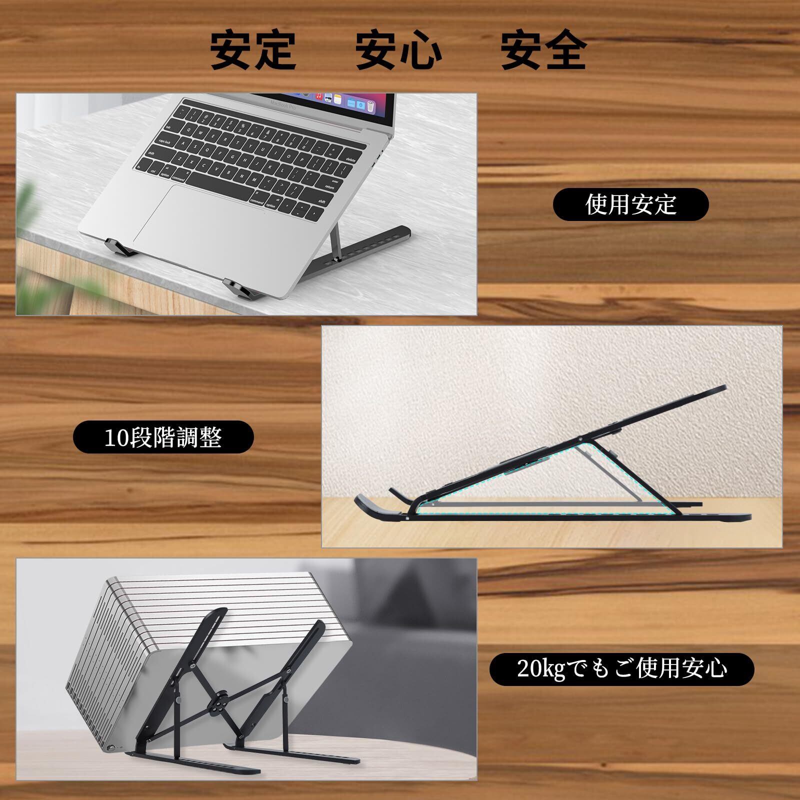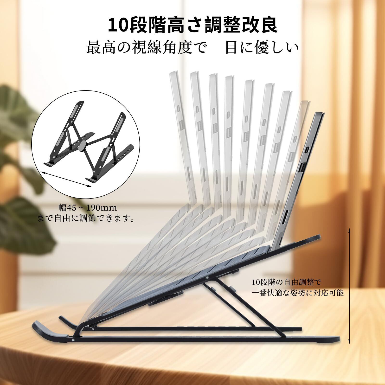 【2024最新デザイン10段階進化改良】VIP客の提案により Kingtech ノートパソコンスタンドは従来の5、6,7段階から10段階へ改良して、必要に応じて パソコン作業時の目線の位置を自由に調節する事ができます。特に長時間作業する必要がある場合は、目線が上がると背筋も伸ばしやすくなり 機器をより快適に操作することができます。